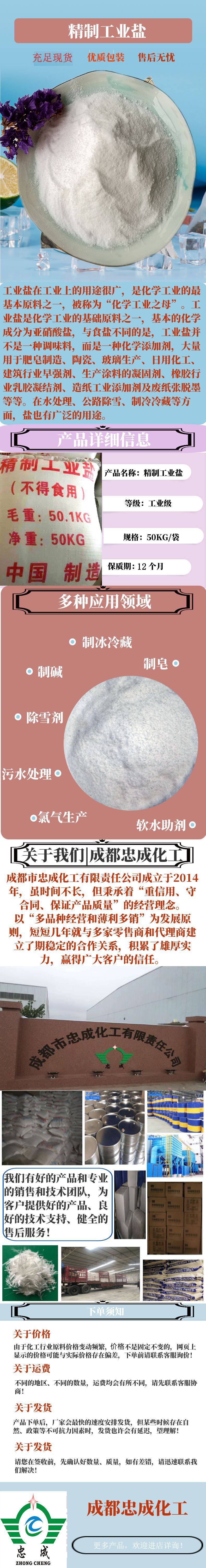 | Use | Water treatment industrial salt, soft water, snow melting agent, printing and dyeing auxiliaries |