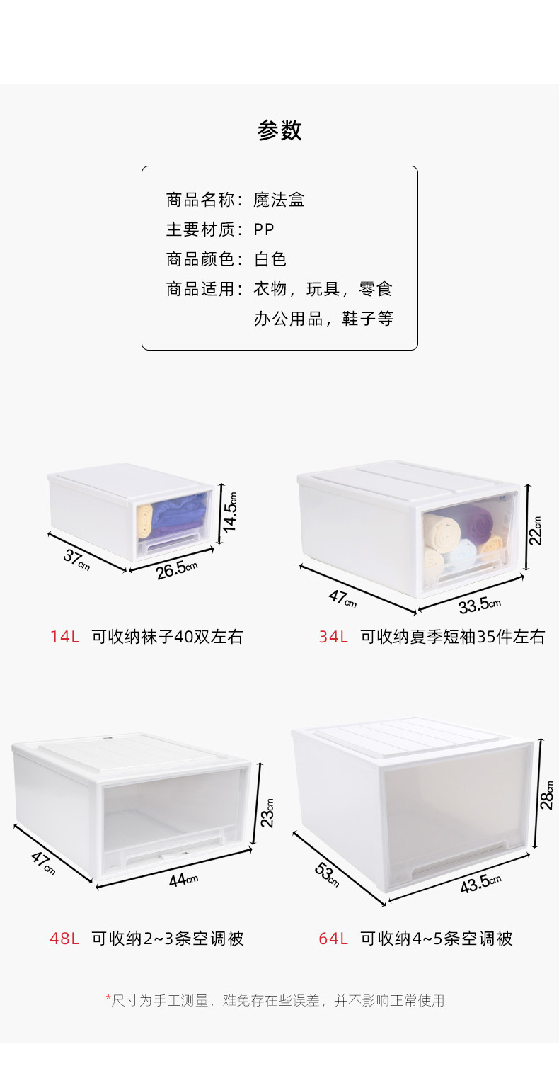 | Color | 14L white frame transparent drawer,34L white frame transparent drawer,48L white frame transparent drawer (with lock),64L white frame transparent drawer |