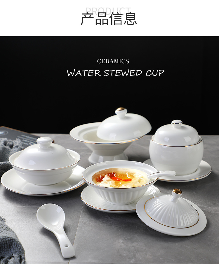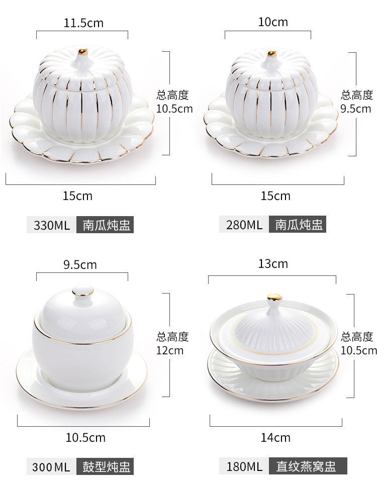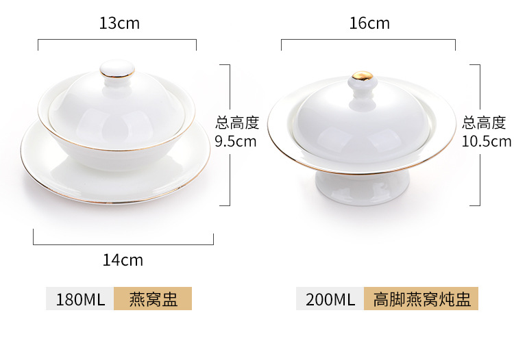 | Color | 300ml (pure white) Heyun Cup,300ml (pure white) Petal Cup,440ml (pure white) Heyun Cup,450ml (pure white) Petal Cup,300ml (gold tracing) Lotus rhyme Cup,300ml (gold tracing) Petal Cup,440ml (tracing gold) Heyun Cup,450ml (gold tracing) Petal Cup,280ml (pure white) pumpkin Cup,330ml (pure white) pumpkin Cup,280ml (tracing gold) pumpkin Cup,330ml (tracing gold) pumpkin Cup,180ml (pure white) 5 inch bird's nest cup,180ml (gold) 5 inch swallow Cup,180ml (pure white) straight bird's nest cup,180ml (tracing gold) straight grain bird's nest cup,300ml (pure white) antique stew Cup,300ml (gold tracing) antique stew Cup,200ml (pure white) high-legged bird's nest cup,200ml (tracing gold) High-footed bird's nest cup,Golden Spoon (Pack of 10),White spoon (Pack of 10) |