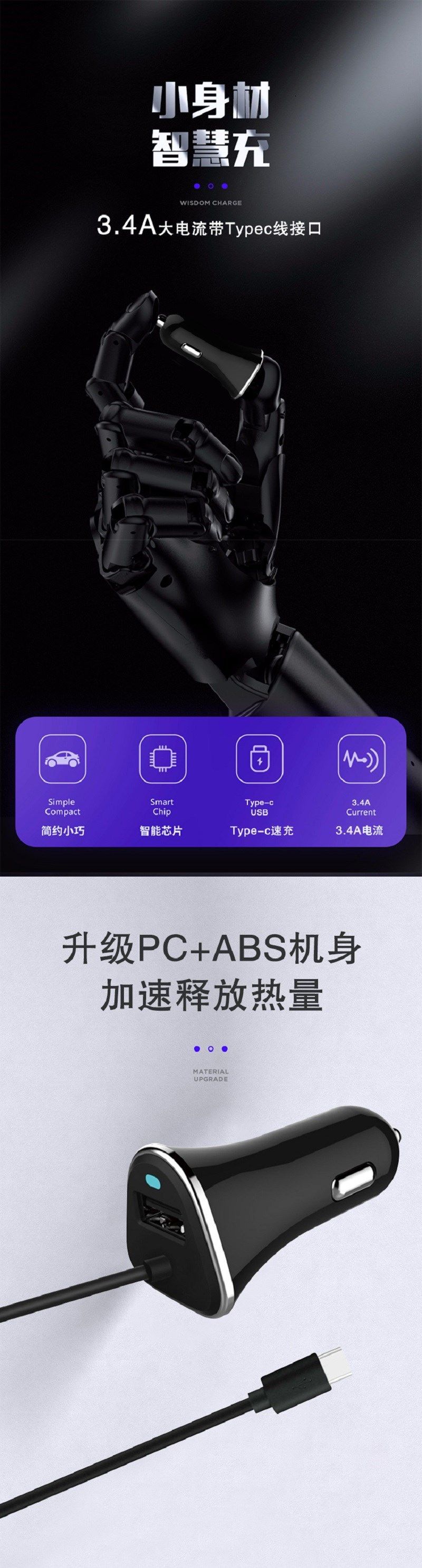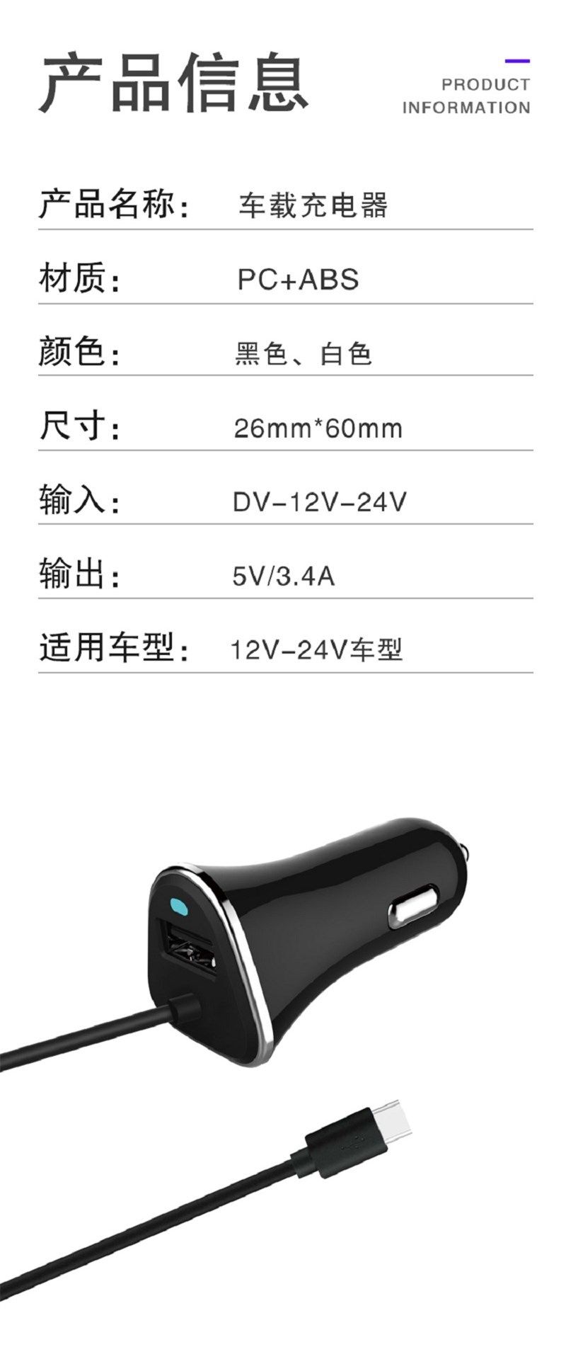 Car charger mobile phone fast charging car electronic belt line one drag two cigarettes 3.4A typce interface car charger