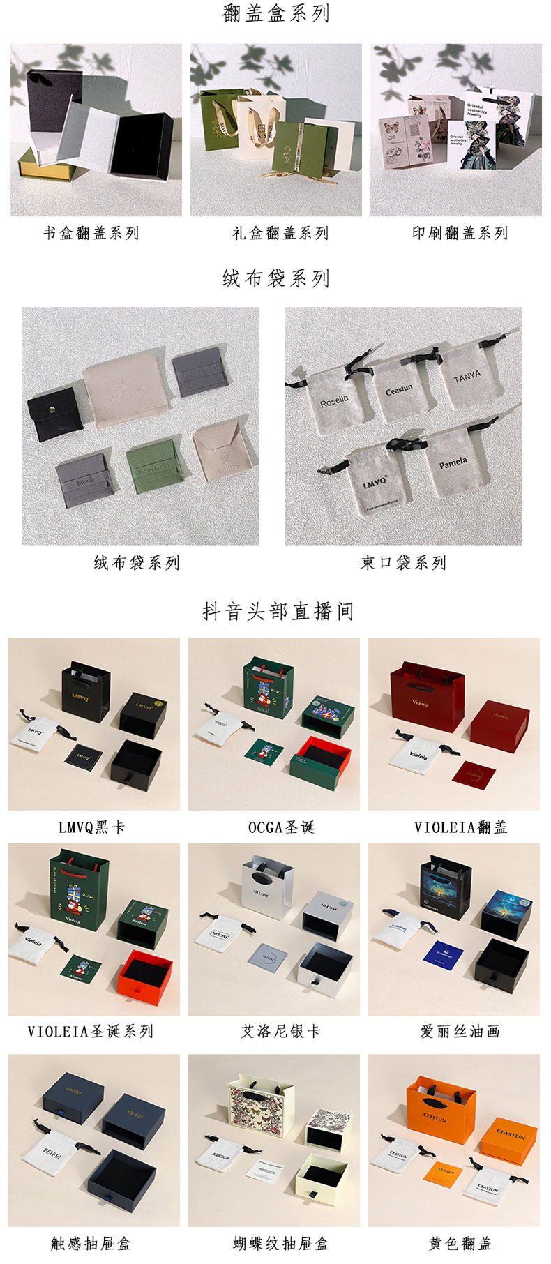 | Specifications and models | Heaven and earth cover jewelry box; customized photo shoot (please note the item number when selecting),Drawer box; customized photo shoot (please note the item number when selecting the model),Creative box; customized photo shoot (remark the item number when selecting the item),Douyin live broadcast room best selling jewelry box; personalized photo shoot (please note the item number when selecting the model),Jewelry bags (flannel bags, drawstring bags); customized photos (please note the item number when selecting),Suspension box; customized photo shoot (remark the item number when selecting the model),Gift box; customized photo shoot (please note the item number when selecting),Personalized photoshoots based on pictures (optional in stock); personalized photoshoots (please note the item number when selecting) |