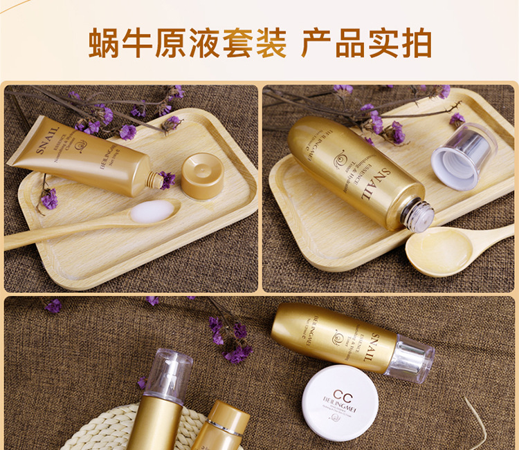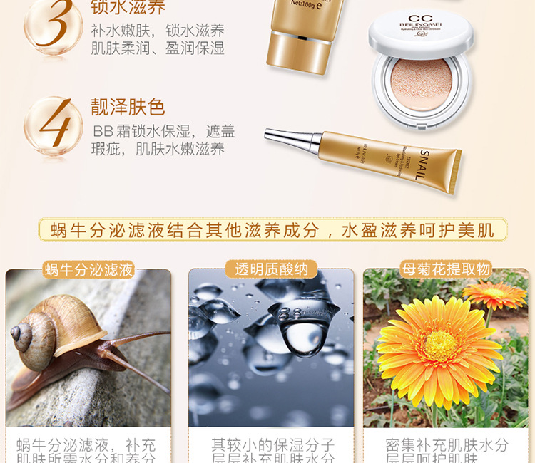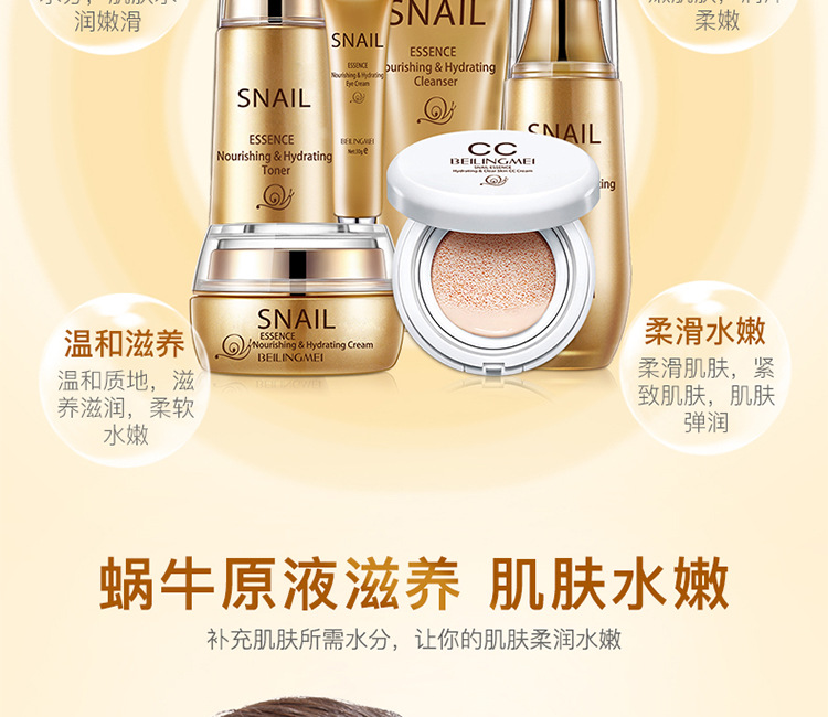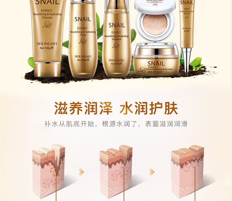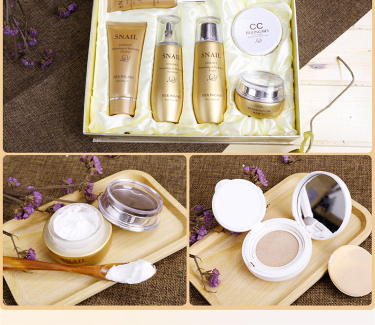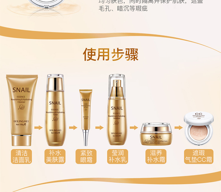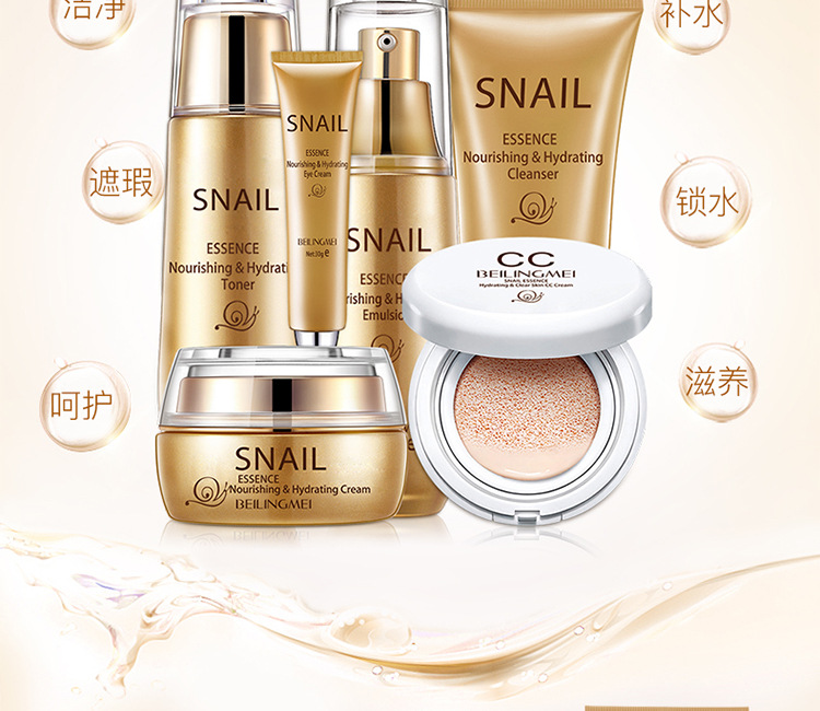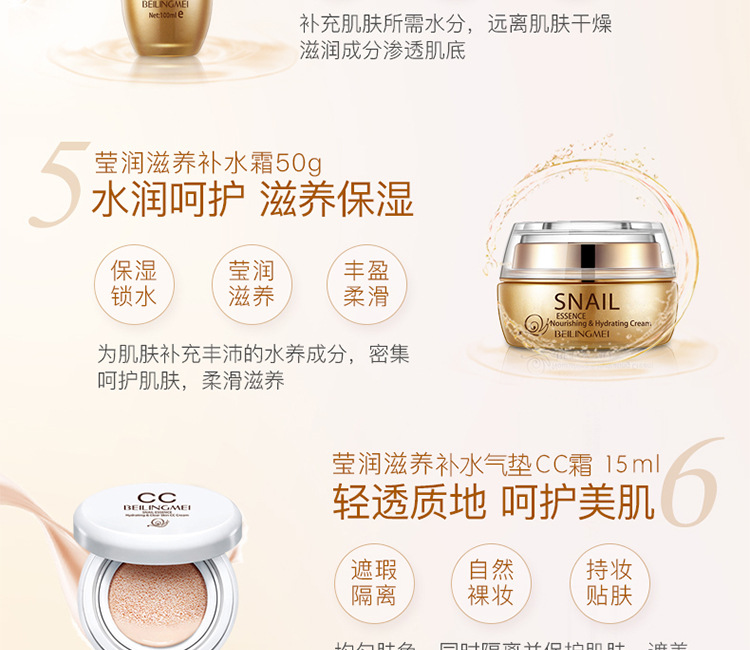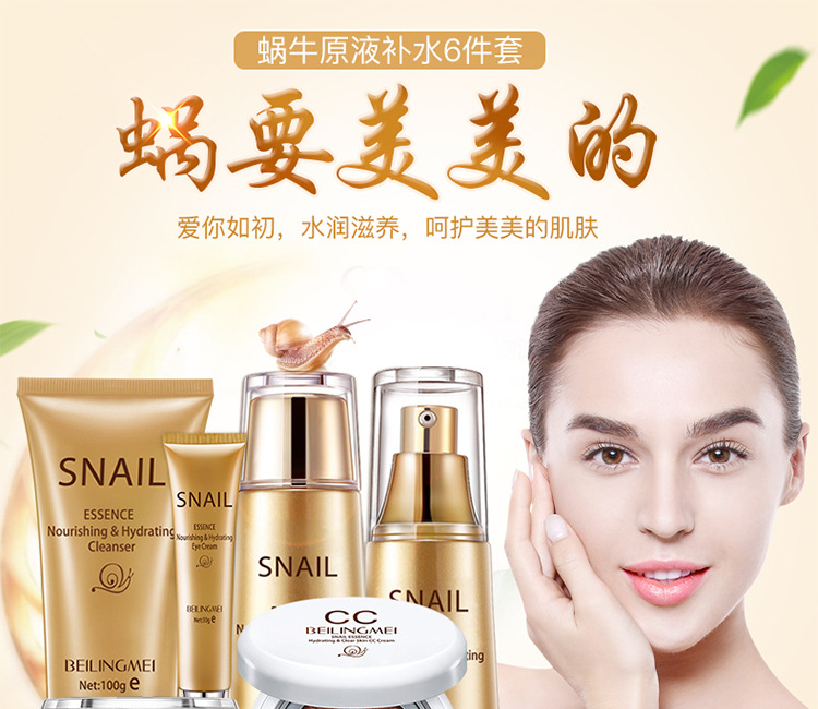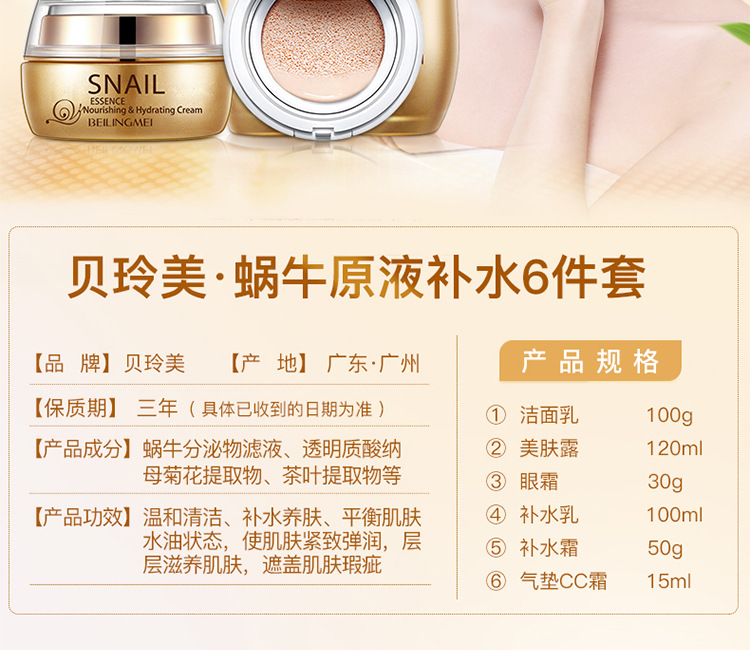 | Product Specifications | Beilingmei Snail Essence Yingrun Hyuperating Eye Cream 30g,Beilingmei Snail Essence Yingrun Hydrating Milk 100ml,Beilingmei Snail Essence 120ml,Beilingmei Snail Essence Yingrun Hydrating Cream 50g,Beilingmei snail essence Yingrun hydrating facial cleanser 100g |