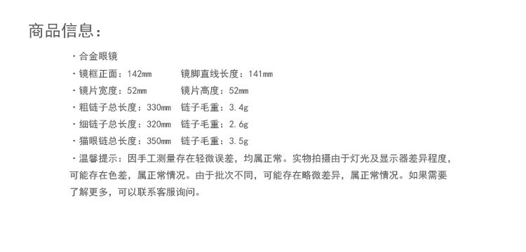 | Frame Color | Silver flat mirror,Gold flat mirror,Black gray sheet,Tea slice,Pink piece,Golden thick chain,Silver thick chain,Gold Thin Chain,Silver Thin Chain,Golden Cat's Eye Chain,Silver Cat's Eye Chain |