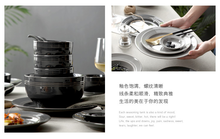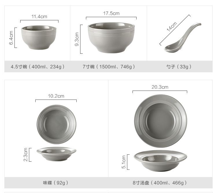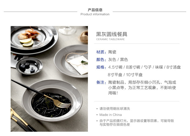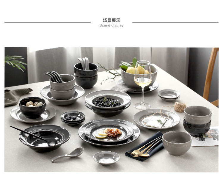 | Color | Gray spoon,Gray flavor dish,Gray 4.5-inch Rice Bowl,Gray soup bowl,Gray 8-inch soup plate,Gray 8-inch shallow plate,Gray 10-inch shallow plate,Black Spoon,Black flavor dish,Black 4.5-inch Rice Bowl,Black Soup Bowl,Black 8-inch soup plate,Black 8-inch shallow plate,Black 10-inch shallow plate |