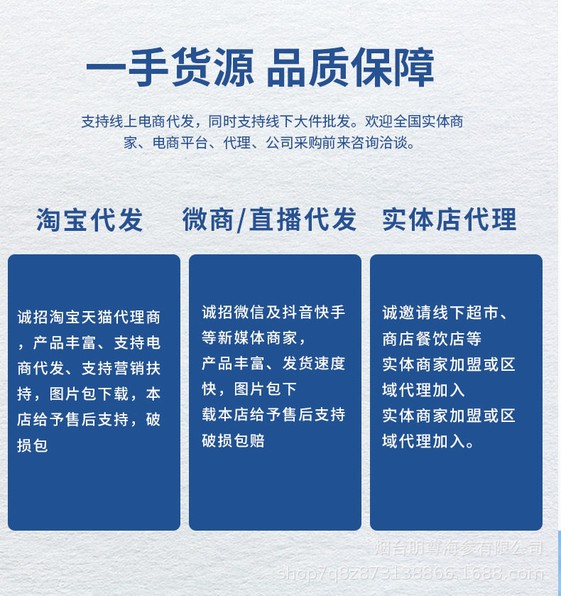 | Packaging specifications | 8-10 pieces/500g (thick meat),11-15 pieces/500g (recommended),16-20 pieces/500g (economical),5-7 pieces/500g (ginseng king),1.0kg [elegant gift box],1.5kg [elegant gift box],2 pounds [exclusive blue gift box],1.5kg [exclusive blue gift box],1.0kg [portable gift box],1.5kg [red portable gift box],2kg [red portable gift box],2kg [exclusive blue gift box],2.5kg [red portable gift box],2.5kg [exclusive blue gift box],8-12 heads/250g (small head tasting size) |