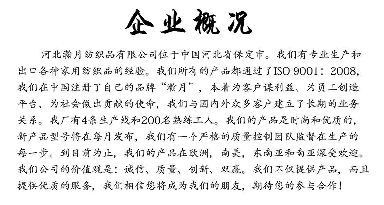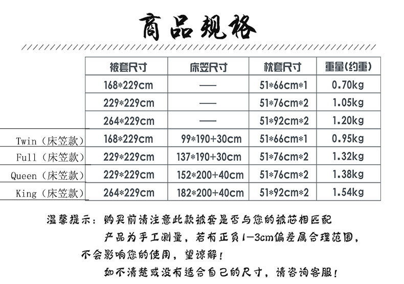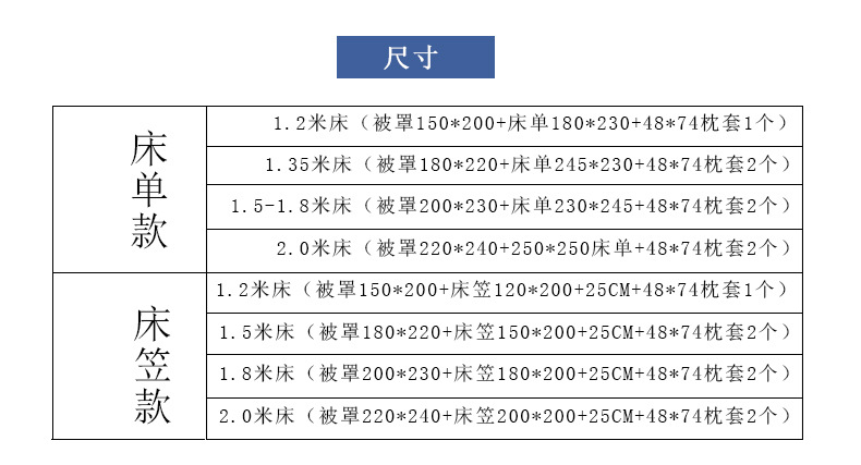 | Dimensions | American Twin: pillowcase 51*66*1 quilt cover 168*229,American Queen: pillowcase 51*76*2 quilt cover 229*229,American King: pillowcase 51*92*2 quilt cover 264*229,Twin (quilt cover 168*229 + bed hat 90*190+30 + pillowcase 51*66*1),Full (quilt cover 229*229 + bed hat 137*190+30 + pillowcase 51*76*2),Queen (quilt cover 229*229 + bed hat 152*200*40 + pillowcase 51*76*2),King (quilt cover 264*229 + bed hat 182*200+40 + pillowcase 51*91*2),Separate quilt cover 160*210,Separate quilt cover 229*229,Separate quilt cover 264*229,1.2 m bed sheets (150*200/180*230/48*74),1.35 m bed sheets (180*220/245*230/48*74-2P),1.5/1.8 m sheets (200*230/230*245/48*74-2P),2.0 m bed sheets (220*240/250*250/48*74-2P),1.2 m bed 150*200/120*200+30/48*74,1.5 m bed 200*230/150*200+30/48*74-2p,1.8 m bed 200*230/180*200+30/48*74-2p,2.0 m bed 220*240/200*200+30/48*74-2p |