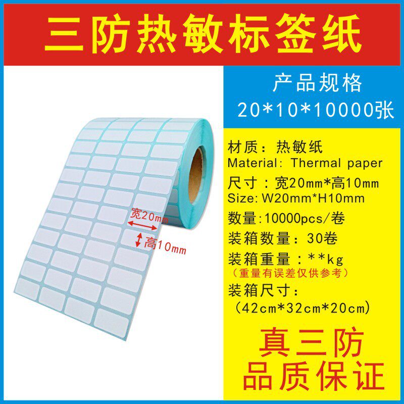 | Size | Waterproof, dustproof, and shockproof 100x100x500 labels, easy-tear per roll [40g white backing],Waterproof, dustproof, and shockproof labels, 100mm x 150mm x 350 sheets per roll, with perforation for easy tear, [40g white backing],Waterproof, dustproof, and shockproof labels, 100mm x 150mm x 500 sheets/roll, easy-tear perforation, [40g white backing],Three-proof 100x100x500 sheets x1 roll with easy-tear line [40g blue background],Waterproof, dustproof, and shockproof labels, 100mm x 150mm x 350 sheets per roll, easy-tear perforation, [40g blue backing],Three-proof 100x150x500 sheets x1 roll with easy-tear line [40g blue background],High-quality three-proof 100x100x500 sheets x1 roll with easy-tear line [50g blue background],High-quality three-proof 100x100x500 sheets x1 roll with easy-tear line [strong adhesive 50g blue background],Classic three-proof 100x100x500 sheets,High-quality three-proof 100x150x350 sheets x1 roll with easy-tear line [50g blue background],High-quality three-proof 100x150x350 sheets,High-quality three-proof 100x150x500 sheets,High-quality three-proof 102x152x350 sheets x1 roll with easy-tear line [50g blue background],Classic three-proof 20x10x3000 sheets x1 roll 2 rows [60g thick blue background],Classic three-proof 20x10x10000 sheets x1 roll 4 rows [60g thick blue background],Classic three-proof 25x15x1000 sheets x1 roll 1 row [60g thick blue background],Classic three-proof 30x10x1500 sheets x1 roll 1 row [60g thick blue background],Classic three-proof 30*15*1000 sheets x1 roll 1 row [60g thick blue background],Classic three-proof 30x20x1000 sheets x1 roll 1 row [60g thick blue background],Classic three-proof 30*25*1000 sheets x1 roll 1 row [60g thick blue background],High-quality three-proof 30x30x800 sheets x1 roll 1 row [50g blue background],Classic three-proof 40x10x1500 sheets x1 roll 1 row [60g thick blue background],Classic three-proof 40x20x1000 sheets x1 roll 1 row [60g thick blue background],Classic three-proof 40x25x800 sheets x1 roll 1 row [60g thick blue background],High-quality three-proof 40x30x800 sheets x1 roll 1 row [50g blue background],Classic three-proof 40x30x800 sheets x1 roll 1 row [60g thick blue background],High-quality three-proof 40*40*500 sheets x1 roll 1 row [50g blue background],High-quality three-proof 40x50x500 sheets x1 roll 1 row [50g blue background],High-quality three-proof 40x60x400 sheets x1 roll 1 row [50g blue background],High-quality three-proof 40x70x500 sheets x1 roll 1 row [50g blue background],High-quality three-proof 40x80x300 sheets x1 roll 1 row [50g blue background],Classic three-proof 50x10x1500 sheets x1 roll 1 row [60g thick blue background],Classic three-proof 50x20x1000 sheets x1 roll 1 row [60g thick blue background],Classic three-proof 50x25x800 sheets x1 roll 1 row [60g thick blue background],High-quality three-proof 50x30x800 sheets x1 roll 1 row [50g blue background],Classic three-proof 50x30x800 sheets x1 roll 1 row [60g thick blue background],High-quality three-proof 50x40x800 sheets x1 roll 1 row [50g blue background],Classic three-proof 50x40x800 sheets x1 roll 1 row [60g thick blue background],High-quality three-proof 50x50x500 sheets x1 roll 1 row [50g blue background],High-quality three-proof 50*70*500 sheets x1 roll 1 row [50g blue background],High-quality three-proof 50*80*300 sheets x1 roll 1 row [50g blue background],High-quality three-proof 50x100x250 sheets x1 roll 1 row [50g blue background],High-quality three-proof 55x100x250 sheets x1 roll 1 row [50g blue background],High-quality three-proof 58x40x700 sheets x1 roll 1 row [50g blue background],Classic three-proof 60x20x1000 sheets x1 roll 1 row [60g thick blue background],High-quality three-proof 60x30x1000 sheets x1 roll 1 row [50g blue background],Classic three-proof 60x30x1000 sheets x1 roll 1 row [60g thick blue background],Waterproof, dustproof, and shockproof labels, 60mm x 40mm x 800 labels/roll, single row [40g white backing],High-quality three-proof 60x40x800 sheets x1 roll 1 row [50g blue background],High-quality three-proof 60x50x500 sheets x1 roll 1 row [50g blue background],High-quality three-proof 60x60x500 sheets x1 roll 1 row [50g blue background],High-quality three-proof 60x80x300 sheets x1 roll 1 row [50g blue background],High-quality three-proof 60x100x250 sheets x1 roll 1 row [50g blue background],High-quality three-proof 70x20x1000 sheets x1 roll 1 row [50g blue background],High-quality three-proof 70x20x2000 sheets x1 roll 1 row [50g blue background],Classic three-proof 70x20x1000 sheets x1 roll 1 row [60g thick blue background],High-quality three-proof 70x30x1000 sheets x1 roll 1 row [50g blue background],Classic three-proof 70x30x1000 sheets x1 roll 1 row [60g thick blue background],High-quality three-proof 70x40x800 sheets x1 roll 1 row [50g blue background],Classic three-proof 70x40x800 sheets x1 roll 1 row [60g thick blue background],High-quality three-proof 70x50x500 sheets x1 roll 1 row [50g blue background],Classic three-proof 70x50x500 sheets x1 roll 1 row [60g thick blue background],High-quality three-proof 70x60x500 sheets x1 roll 1 row [50g blue background],High-quality three-proof 70x70x500 sheets x1 roll 1 row [50g blue background],High-quality three-proof 70*90*500 sheets x1 roll 1 row [50g blue background],High-quality three-proof 70x100x500 sheets x1 roll [50g blue background],High-quality three-proof 75*50*500 sheets x1 roll 1 row [50g blue background],High-quality three-proof 75x100x500 sheets x1 roll 1 row [50g blue background],High-quality three-proof 80*30*1000 sheets x1 roll 1 row [50g blue background],High-quality three-proof 80x40x800 sheets x1 roll 1 row [50g blue background],Classic three-proof 80x40x800 sheets x1 roll 1 row [60g thick blue background],High-quality three-proof 80x50x500 sheets x1 roll 1 row [50g blue background],Classic three-proof 80x50x500 sheets x1 roll 1 row [60g thick blue background],High-quality three-proof 80x60x500 sheets x1 roll [50g blue background],Cla