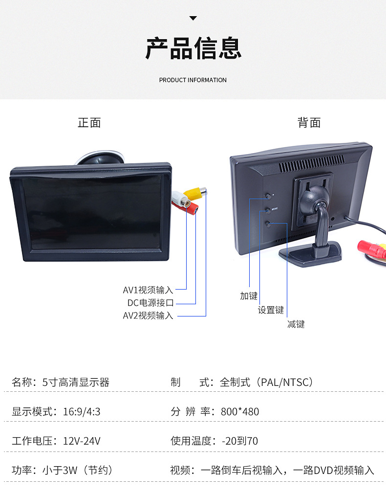 5-inch desktop suction cup monitor car LCD high-definition screen intelligent display two-way video input reversing priority