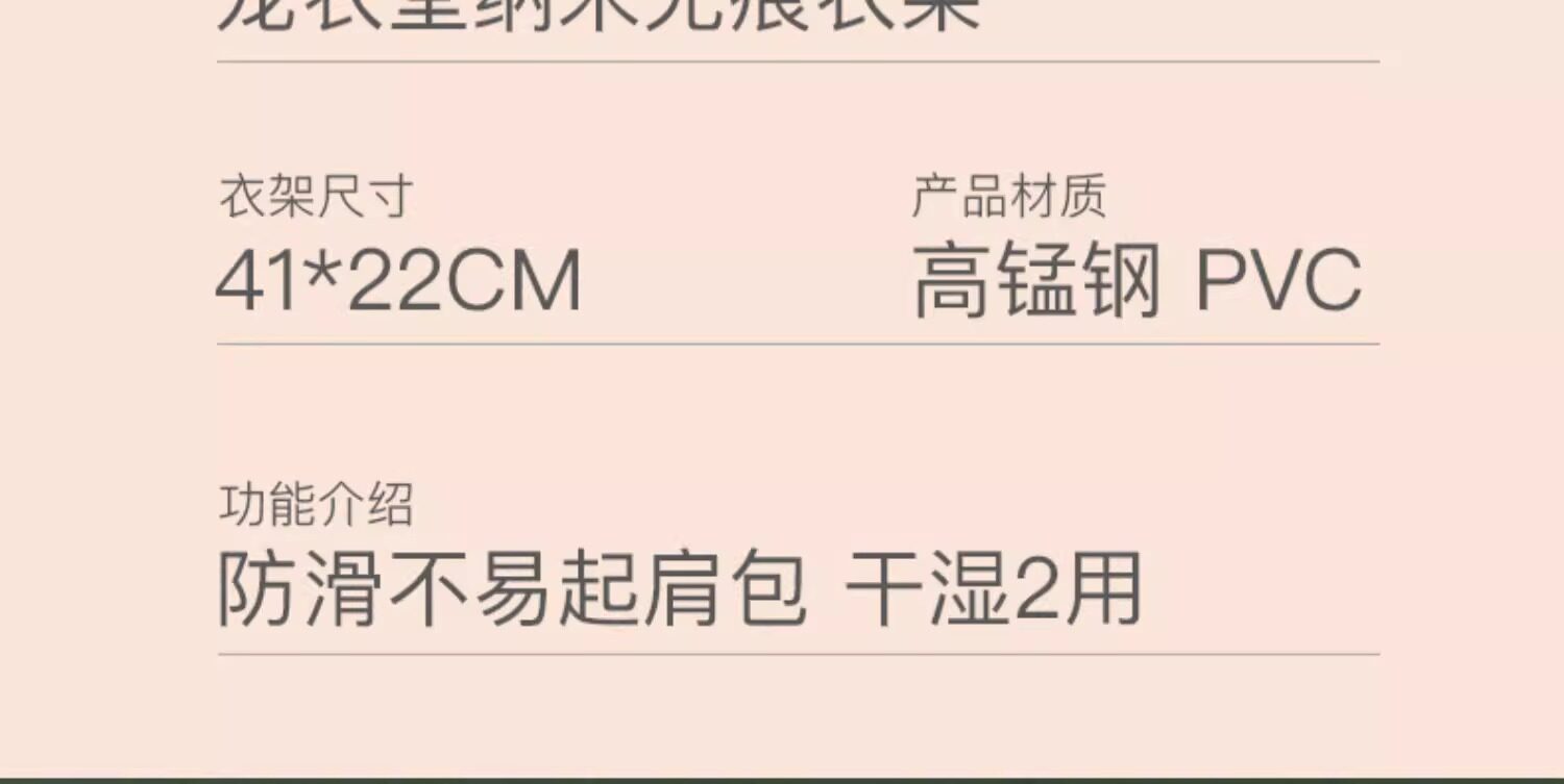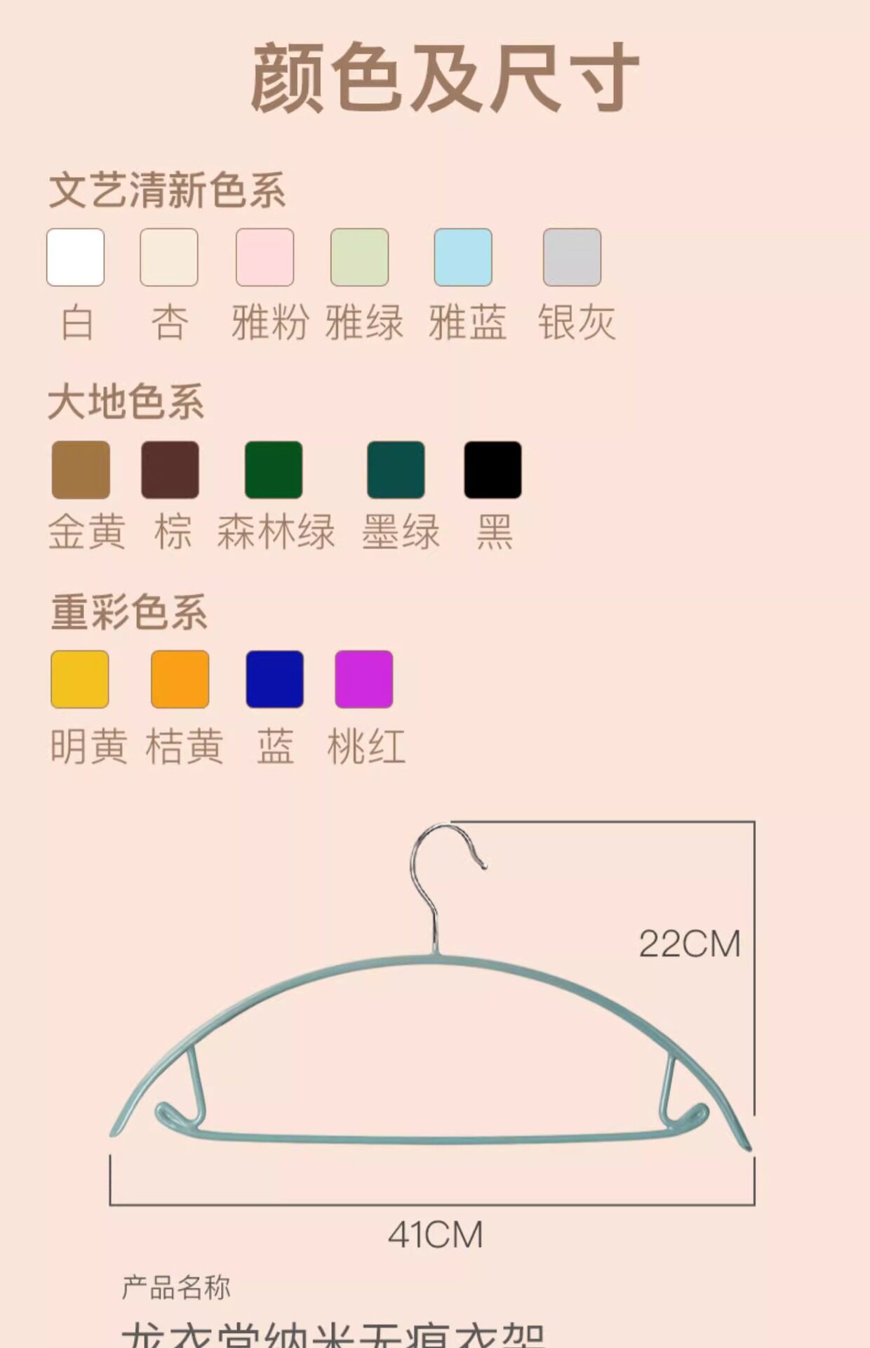 | Color | Plastic dipped traceless anti-slip clothes hanger [white],Plastic dipped seamless anti-slip clothes hanger [silver gray],Plastic dipped seamless anti-slip clothes hanger [golden night black],Plastic dipped traceless anti-slip clothes hanger [dark green],Plastic dipped seamless anti-slip clothes hanger [pink],Plastic dipped traceless anti-slip clothes hanger [nordic green],Plastic dipped traceless anti-slip clothes hanger [nordic blue],Plastic dipped seamless anti-slip clothes hanger [apricot color] |