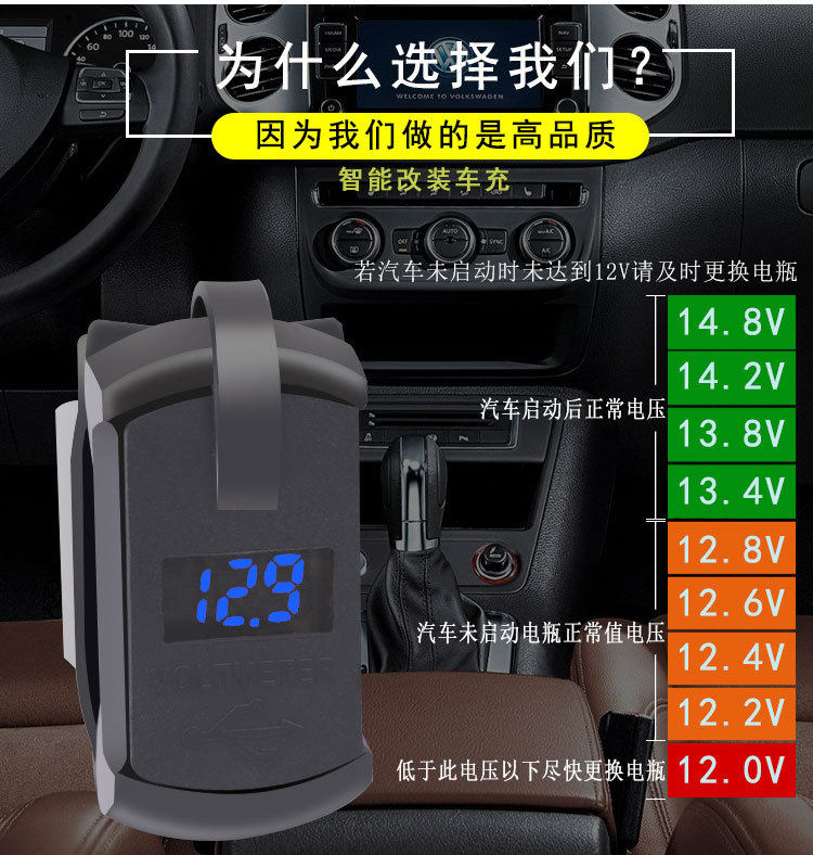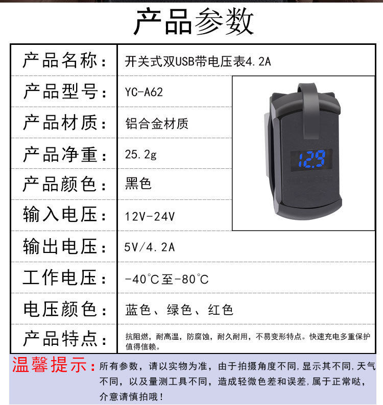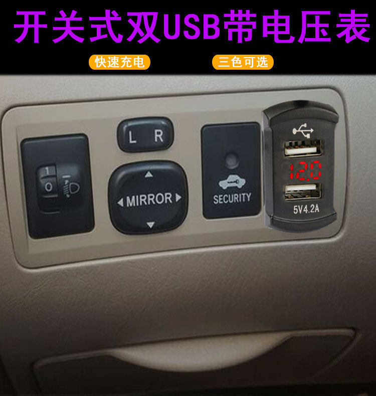 | Model | Switch type dual USB with red voltmeter,Switch type dual USB with blue voltmeter,Switch type dual USB with green voltmeter |