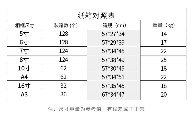 | Inner frame size | 5 inch hanging pendulum dual-use: can put 8.9*12.7cm,6 inch hanging pendulum dual-purpose: can put 10.2*15.2cm,7 inch hanging dual-use: can put 12.7*17.7cm,8 inch hanging pendulum dual-purpose: can put 15.2*20.3cm,10 inch hanging pendulum dual-purpose: can put 20.3*25.4cm,A4 inch hanging dual-purpose: can put 20.8*9.7cm,16 inch wall: can put 29.3*39.3cm,A3 Wall: can put 28.6*41cm |