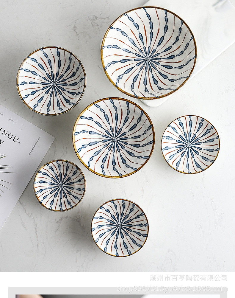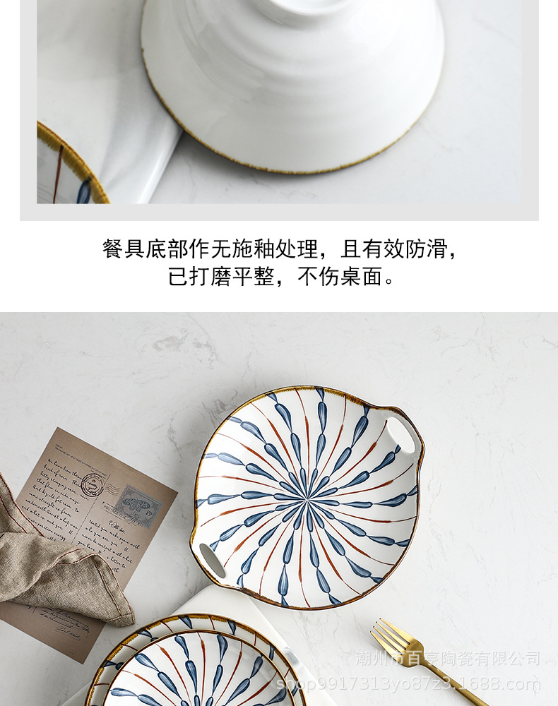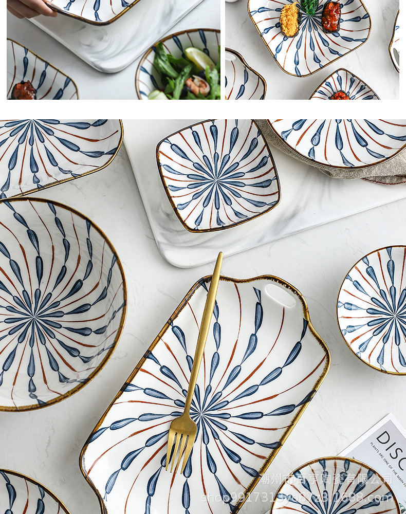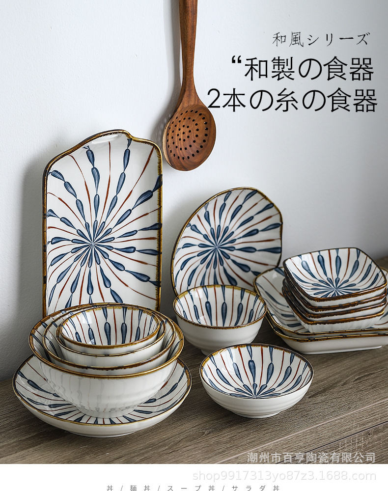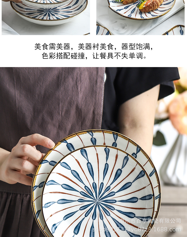 Sparks Japanese Style Hefeng Ceramic Bowl and Dish Plate Retro Underglaze Color Household Rice Bowl Noodles Bowl and Dish Tableware Set