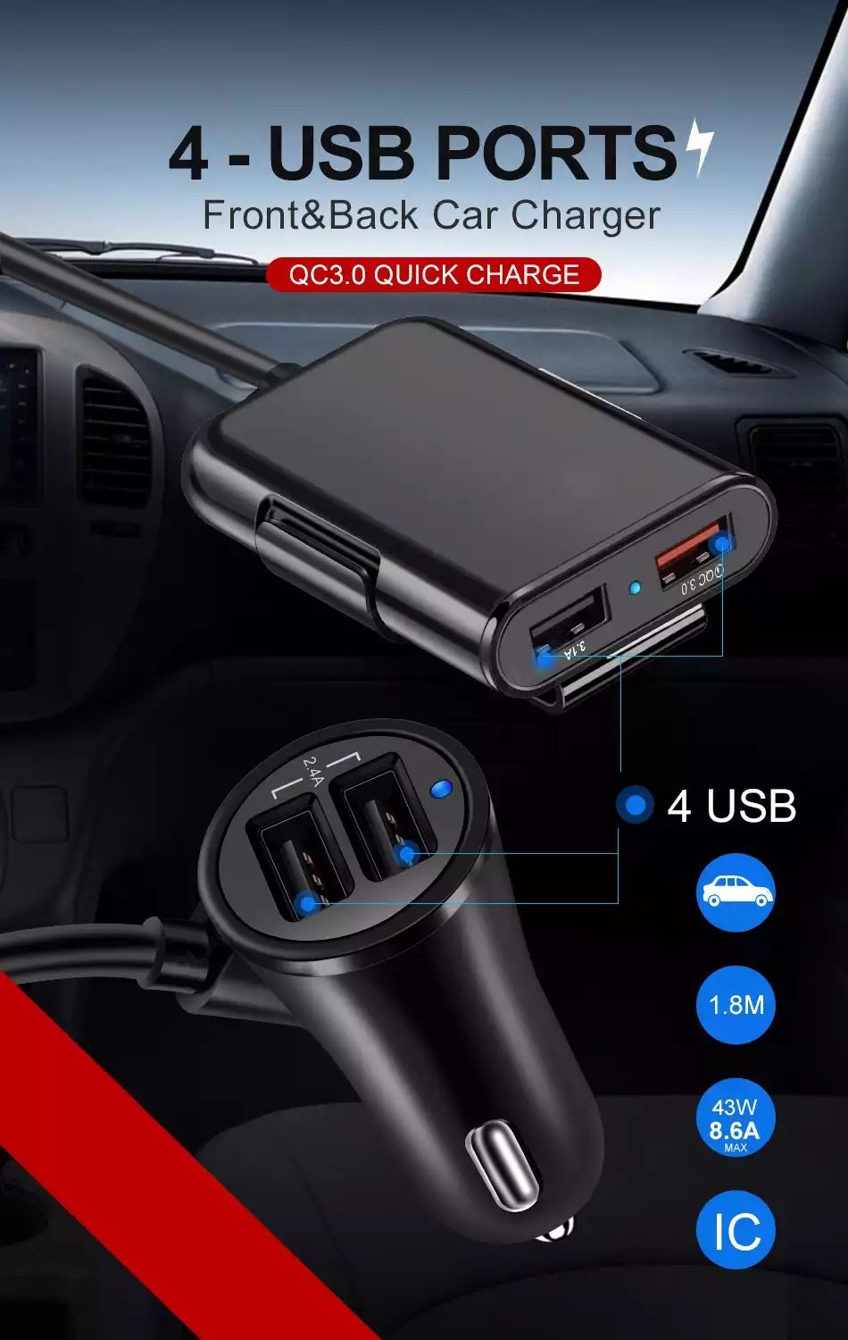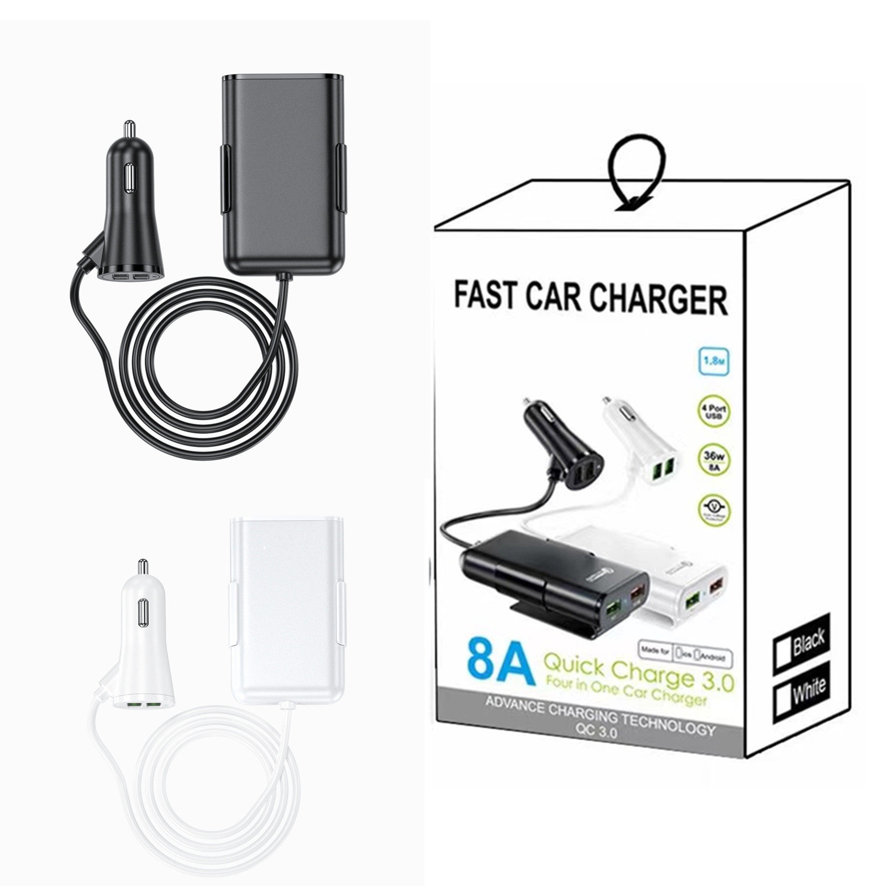 40W 8A Qc3.0 Front and Rear Seat Car Charger Fast Charging One to Four 4Usb with Cable Multi-Port Flash Charging Car Charger