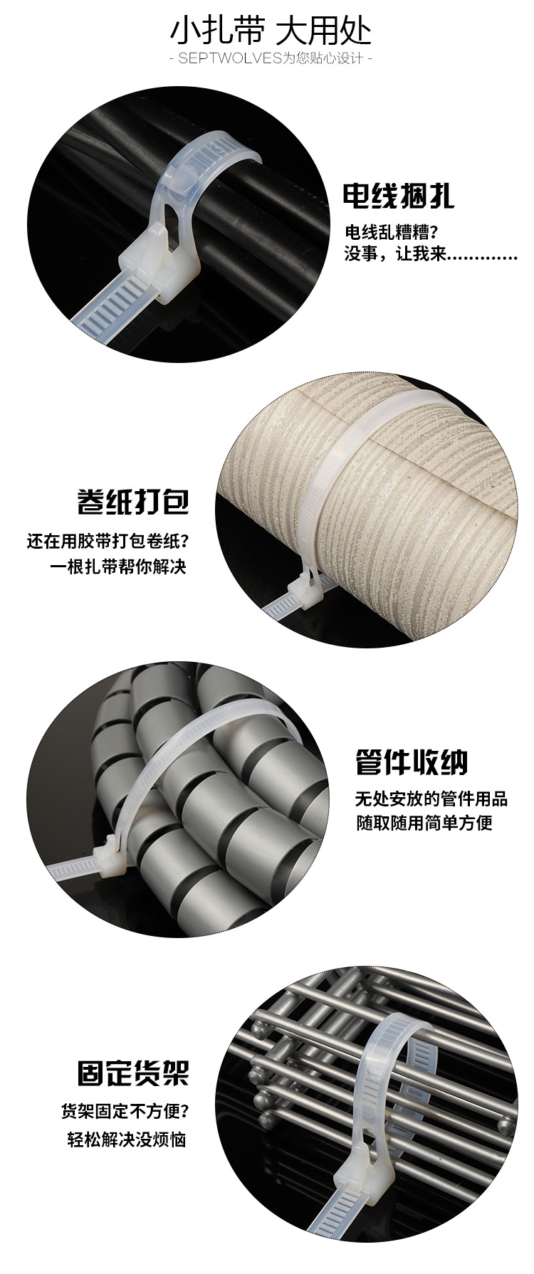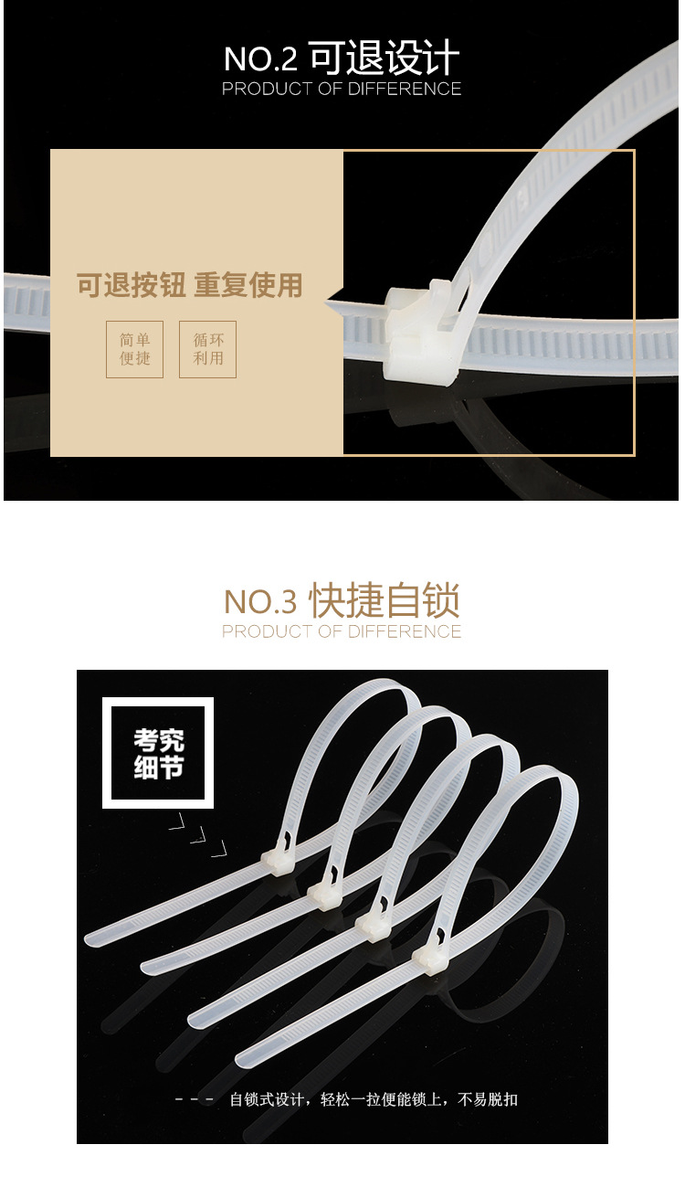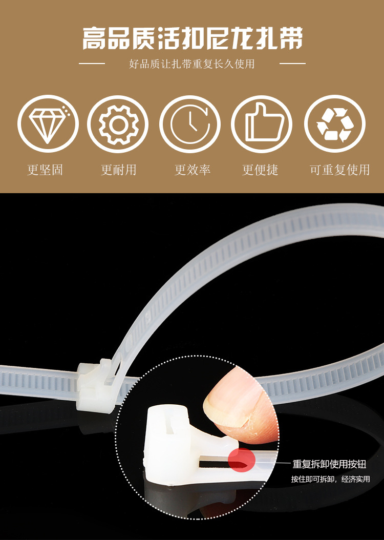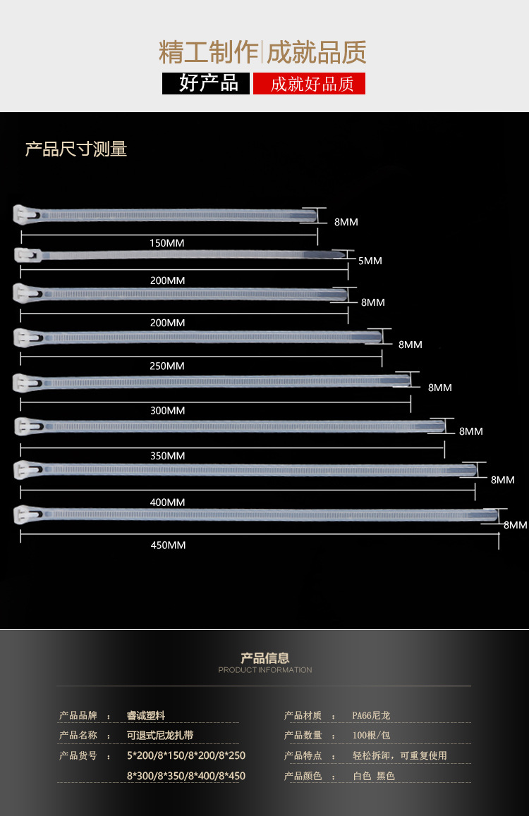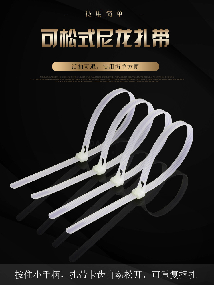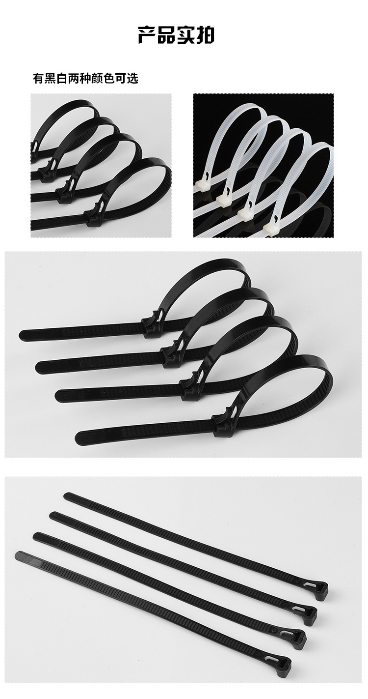 | Specifications and models | Black; adjustable buckle 5*200/100 pieces,Black; adjustable buckle 8*150mm / 100 pieces,Black; adjustable buckle 8*200/100 pieces,Black; adjustable buckle 8*250mm / 100 pieces,Black; adjustable buckle 8*300/100 pieces,Black; adjustable buckle 8*350/100 pieces,Black; adjustable buckle 8*400/100 pieces,Black; adjustable buckle 8*450/100 pieces,Black; adjustable buckle 8*500/100 pieces,Black; adjustable buckle 8*600/100 pieces,White; adjustable buckle 5*200/100 pieces,White; adjustable buckle 8*150mm / 100 pieces,White; adjustable buckle 8*200/100 pieces,White; buckle 8*250*/100 pieces,White; adjustable buckle 8*300/100 pieces,White; adjustable buckle 8*350/100 pieces,White; adjustable buckle 8*400/100 pieces,White; adjustable buckle 8*450/100 pieces,White; buckle 8*500/100 pieces,White; buckle 8*600/100 pieces |
