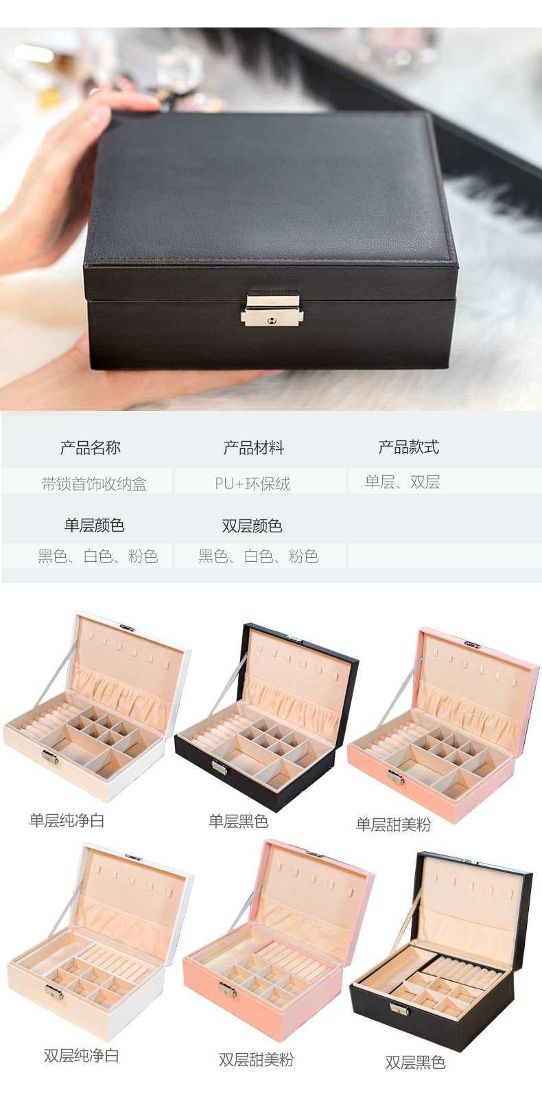 | Specification model | Double layer pink leather model; size 23*17*9cm,Double layer dark green leather model; size 23*17*9cm,Double layer black leather model; size 23*17*9cm,Double layer white leather model; size 23*17*9cm,Single layer pink; size 23*17*9cm,Single layer black; size 23*17*9cm,Single layer white; size 23*17*9cm |