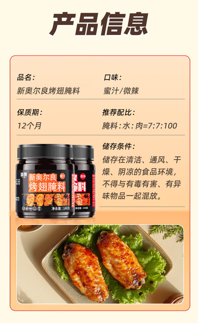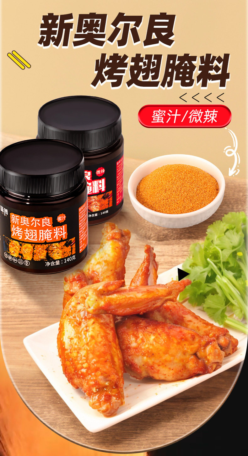 | Packaging specifications | 140g/slightly spicy Orleans marinade,140g/Honey Orleans marinade |