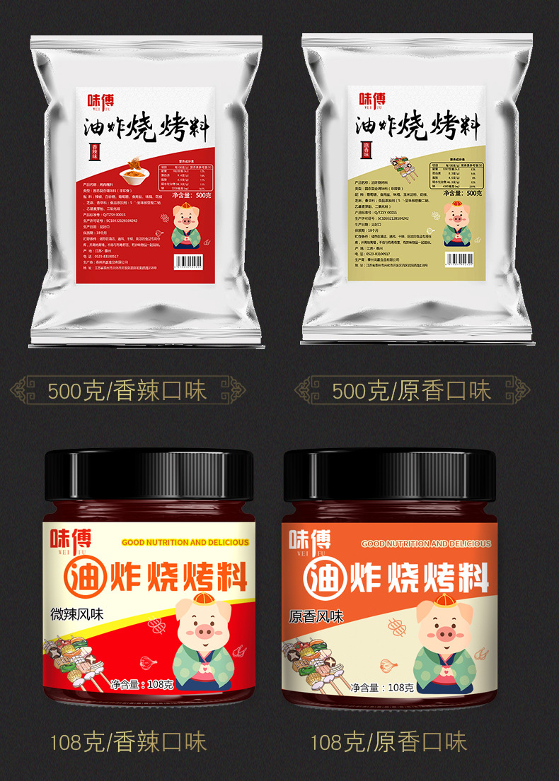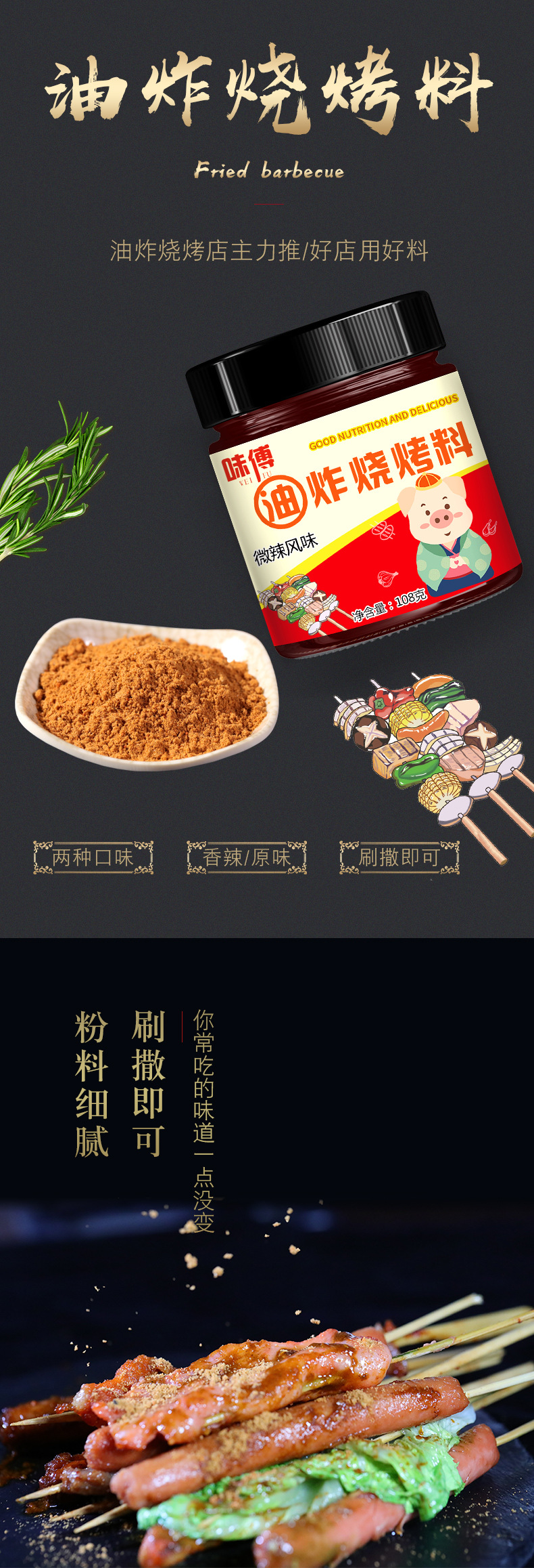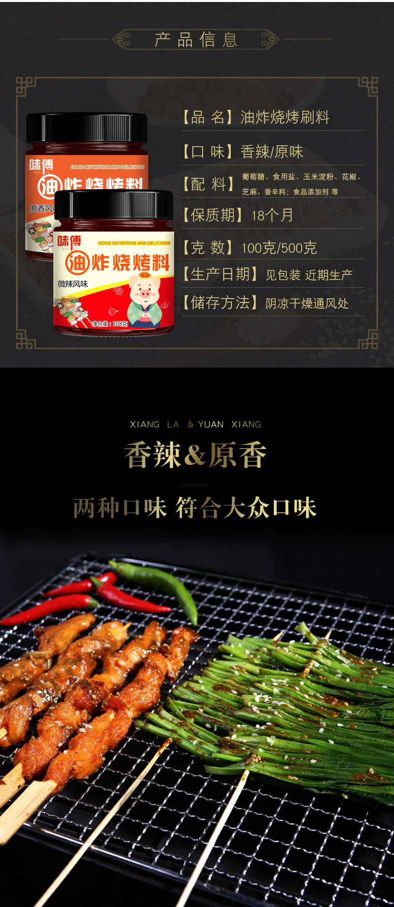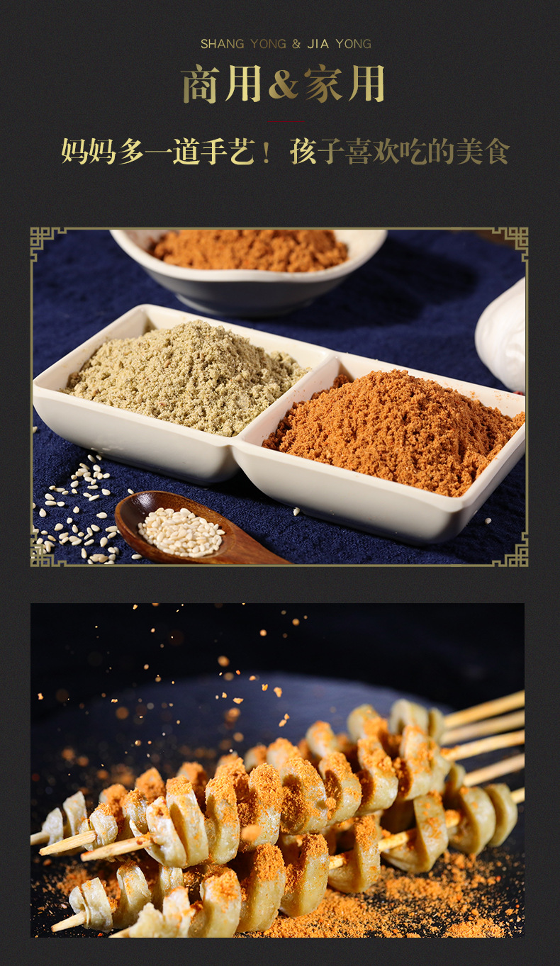 | Packaging specifications | 500g/bottle of fried barbecue powder/spicy,500g/bottle of fried barbecue powder/sweet |