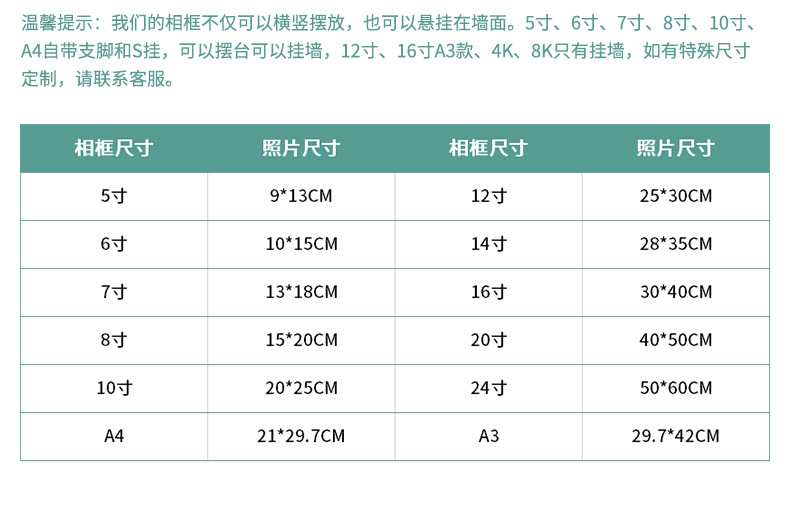 | Inner frame size | 5 inch (9*13CM) table,6 inch (10*15CM) table,7 inch (13*18CM) pendulum wall,8 inch (15*20CM) pendulum wall,10 inch (20*25CM) pendulum wall,12 inch (25*30CM) wall,A4(21*29.7CM) pendulum wall hanging,16 inch (30*40CM) wall,3.5 inch (6*9CM) table |