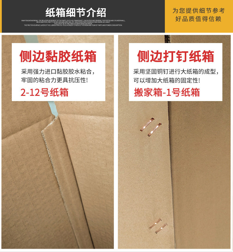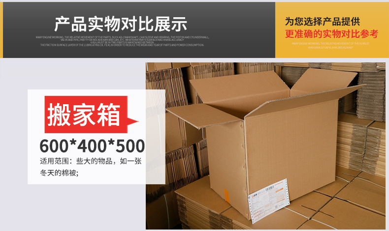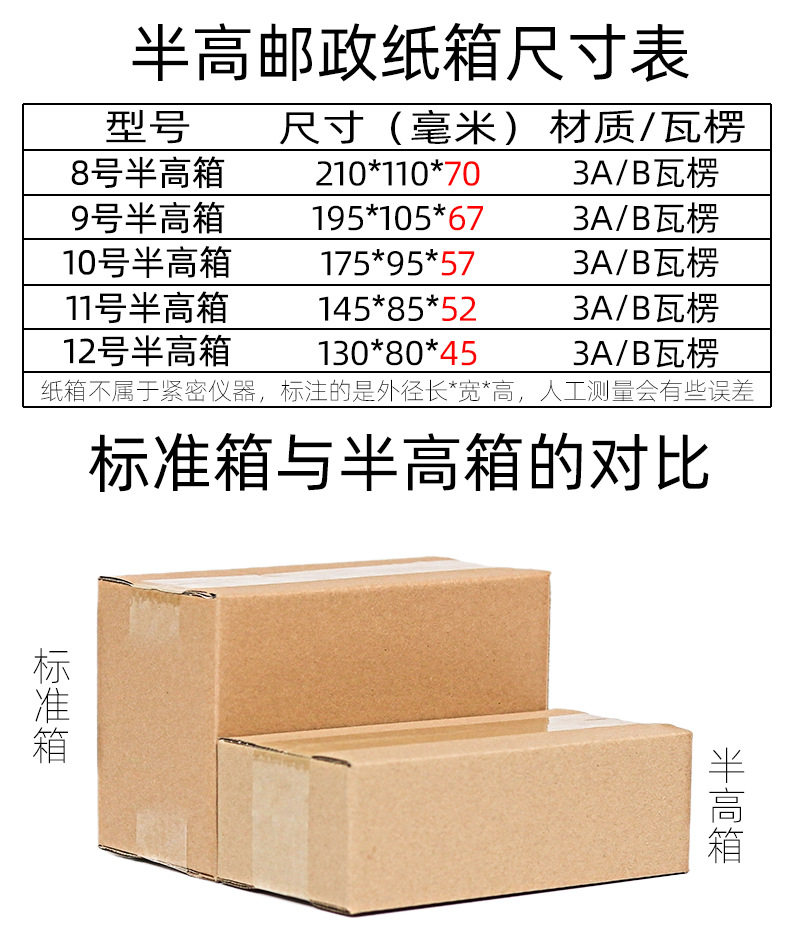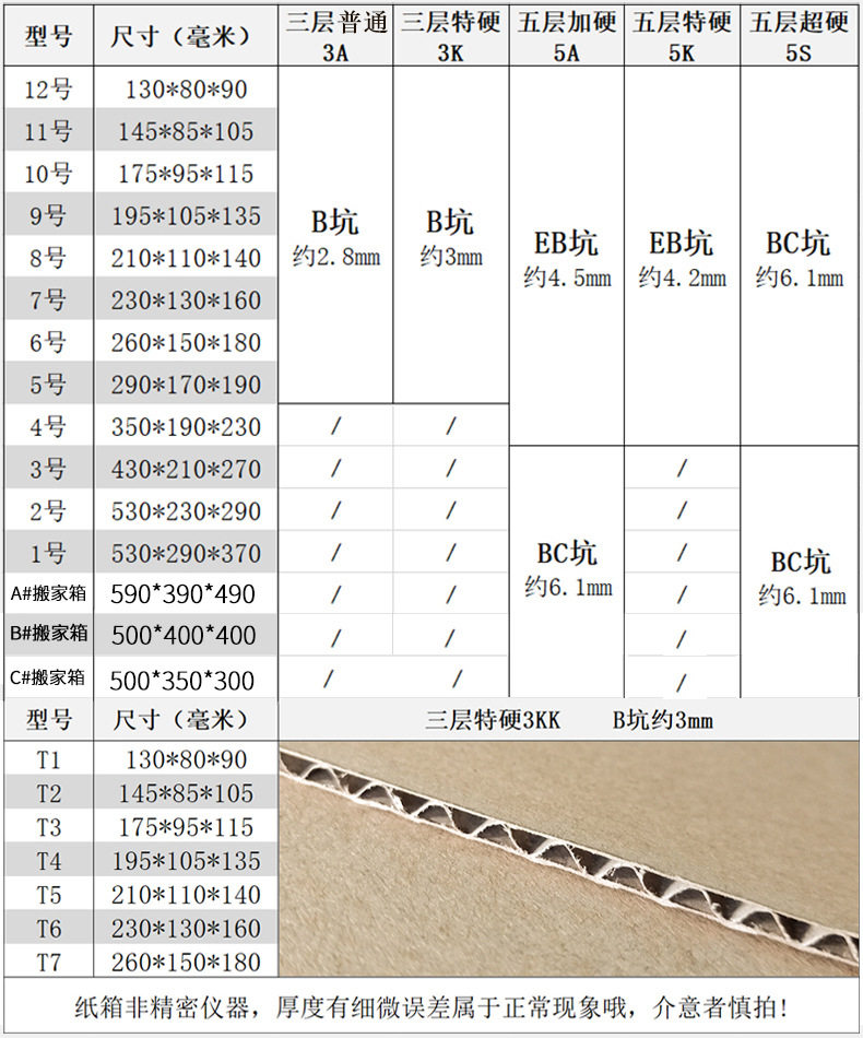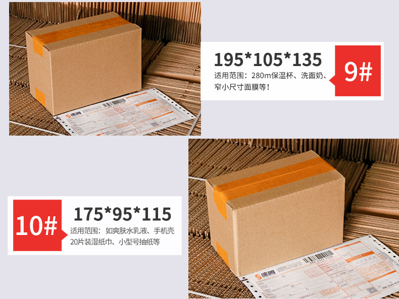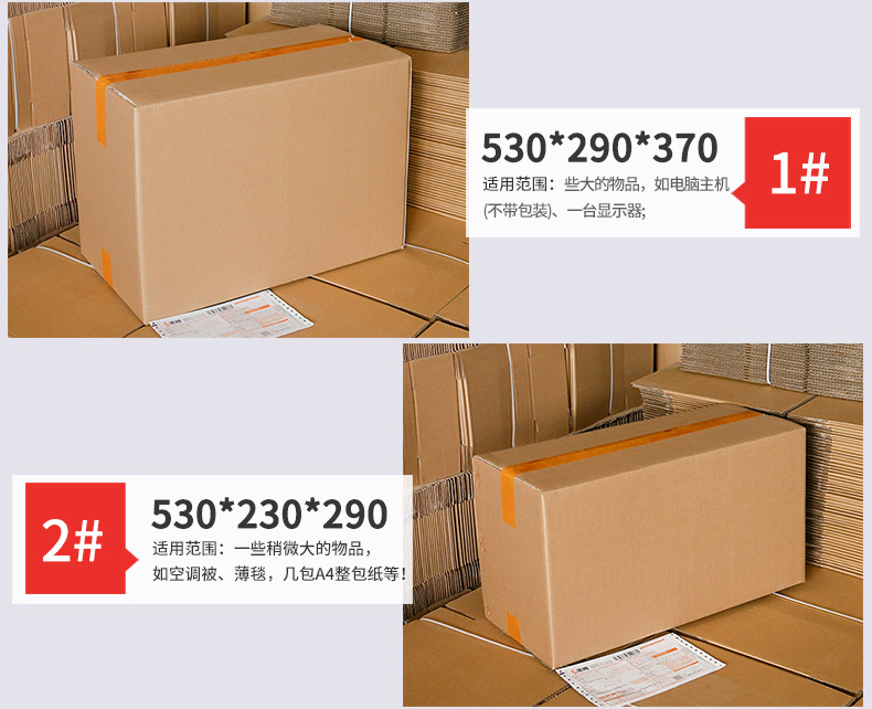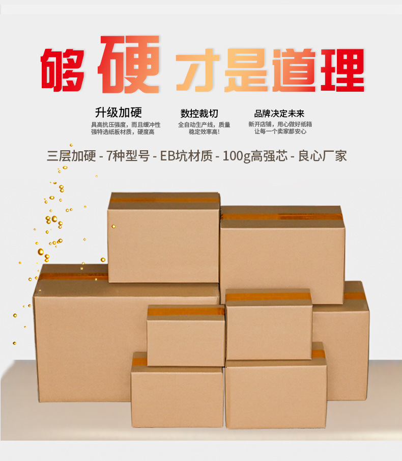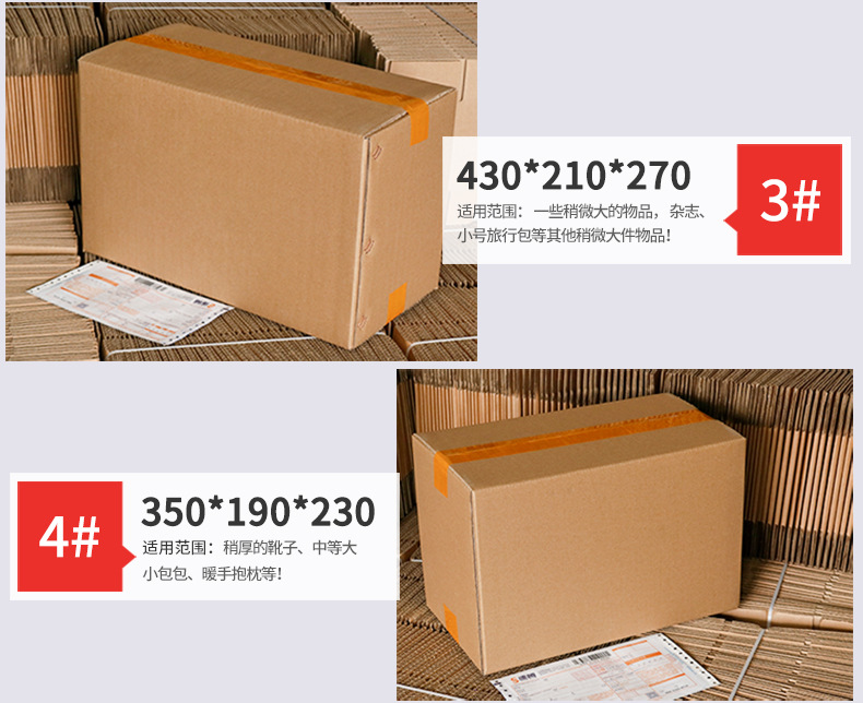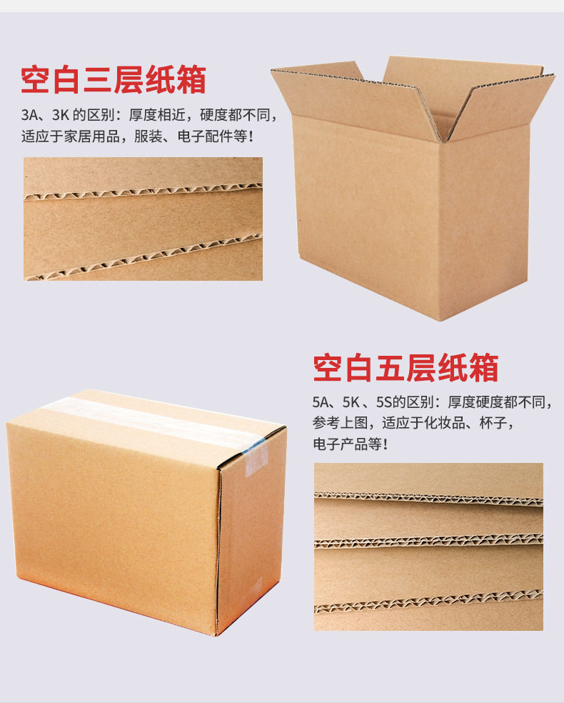 | Specifications and models | No. 12 (130*80*90); three layers/ordinary,No. 12 (130*80*90); three layers/hardened,No. 12 (130*80*90); three layers/extra hard,No. 12 (130*80*90); three layers/super hard,No. 12 (130*80*90); five layers/high density hard,No. 12 (130*80*90); three layers/hardened (height reduced by half),No. 11 (145*85*105); three layers/ordinary,No. 11 (145*85*105); three layers/hardened,No. 11 (145*85*105); three layers/extra hard,No. 11 (145*85*105); three layers/super hard,No. 11 (145*85*105); five layers/high density hard,No. 11 (145*85*105); three layers/hardened (height reduced by half),No. 10 (175*95*115); three layers/ordinary,No. 10 (175*95*115); three layers/hardened,No. 10 (175*95*115); three layers/extra hard,No. 10 (175*95*115); three layers/super hard,No. 10 (175*95*115); five layers/high density hard,No. 10 (175*95*115); three layers/hardened (height reduced by half),No. 10 (175*95*115); five layers/cow card super hard,No. 9 (195*105*135); three layers/ordinary,No. 9 (195*105*135); three layers/hardened,No. 9 (195*105*135); three layers/extra hard,No. 9 (195*105*135); three layers/super hard,No. 9 (195*105*135); five layers/high density hard,No. 9 (195*105*135); three layers/hardened (height reduced by half),No. 9 (195*105*135); five layers/cow card super hard,No. 8 (210*110*140); three layers/ordinary,No. 8 (210*110*140); three layers/hardened,No. 8 (210*110*140); three layers/extra hard,No. 8 (210*110*140); three layers/super hard,No. 8 (210*110*140); five layers/high density hard,No. 8 (210*110*140); three layers/hardened (height reduced by half),No. 8 (210*110*140); five layers/cow card super hard,No. 7 (230*130*160); three layers/standard,No. 7 (230*130*160); three layers/hardened,No. 7 (230*130*160); three layers/extra hard,No. 7 (230*130*160); three layers/super hard,No. 7 (230*130*160); five layers/high density hard,No. 7 (230*130*160); three layers/hardened (height reduced by half),No. 7 (230*130*160); five layers/cow card super hard,No. 6 (260*150*180); three layers/hardened,No. 6 (260*150*180); three layers/extra hard,No. 6 (260*150*180); three layers/super hard,No. 6 (260*150*180); five layers/high density hard,No. 6 (260*150*180); five layers/cow card super hard,No. 5 (290*170*190); three layers/hardened,No. 5 (290*170*190); three layers/extra hard,No. 5 (290*170*190); three layers/super hard,No. 5 (290*170*190); five layers/high density hard,No. 5 (290*170*190); five-layer/cow card super hard,No. 4 (350*190*230); three layers/hardened,No. 4 (350*190*230); three layers/extra hard,No. 4 (350*190*230); three layers/super hard,No. 4 (350*190*230); five layers/high density hard,No. 4 (350*190*230); five layers/cow card super hard,No. 3 (430*210*270); three layers/super hard,No. 3 (430*210*270); five layers/high density hard,No. 3 (430*210*270); five layers/cow card super hard,No. 2 (530*230*290); five layers/cow card super hard,No. 2 (530*230*290); five layers/hardened,No. 1 (530*290*370); five-layer/cow card super hard,No. 1 (530*290*370); five layers/hardened,A#Moving box (600*400*500); five layers/cow card super hard,A # Moving box (600*400*500); five layers/hardened |