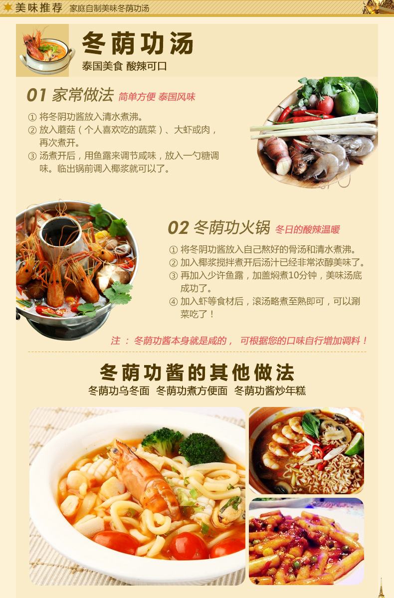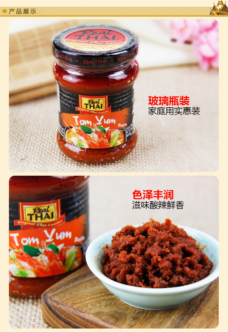 | Specifications | [single bottle] yellow curry paste 227g (mild and mellow),[single bottle] red curry paste 227g (spicy and rich),[single bottle] green curry paste 227g (spicy and refreshing),[single bottle] tom yum sauce 227g (sour and spicy) |