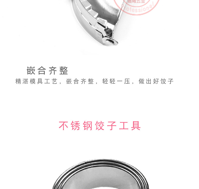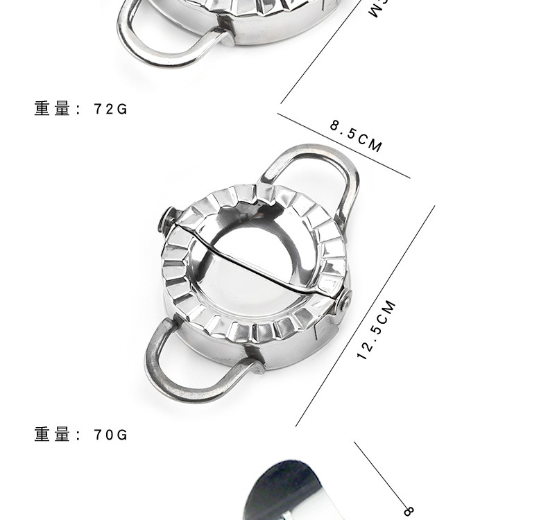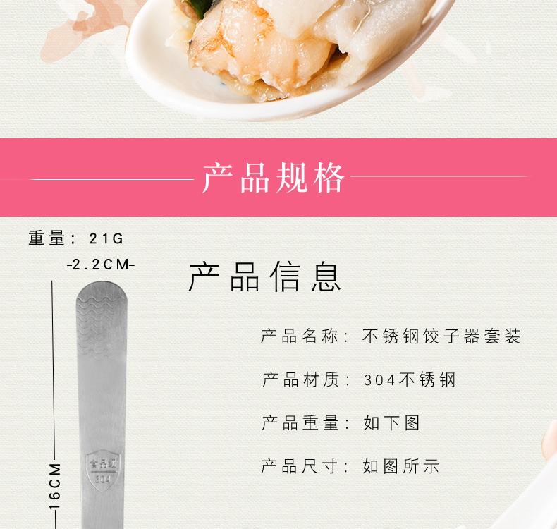 | Specifications | 304 large dumpling,304 small dumpling,304 round skin cutter,304 pattern skin cutter,304 small dumpling wrapper,304 large dumpling wrapper,304 stuffing pick,304 two-piece (large),304 two-piece (small),304 three-piece set (small),304 three-piece set (large) |