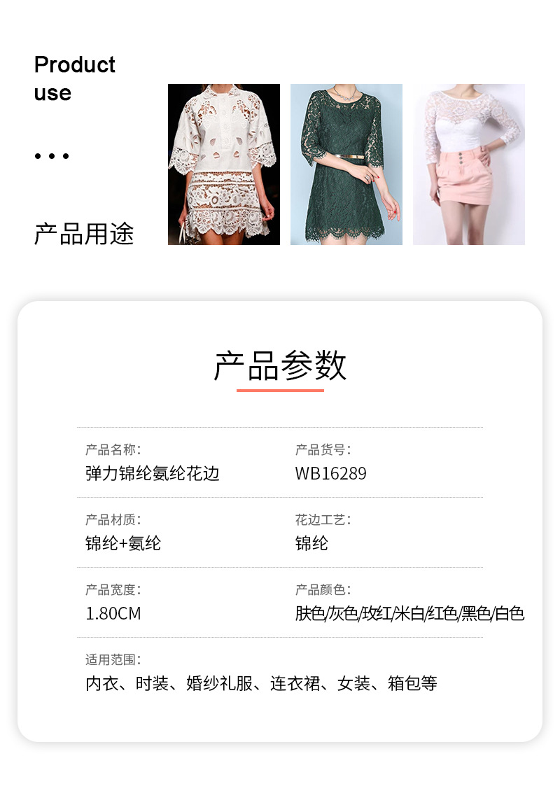 | Scope of application | Pajamas,Underwear,Women's Clothing,Headwear,Dress,Home Furnishing,Bedding,Curtains,Wedding dress,Bra,Accessories,Home Textiles,DIY handmade,Skirt,lace underwear,Home Textile Supplies,Gift flower packaging,Home soft decoration |