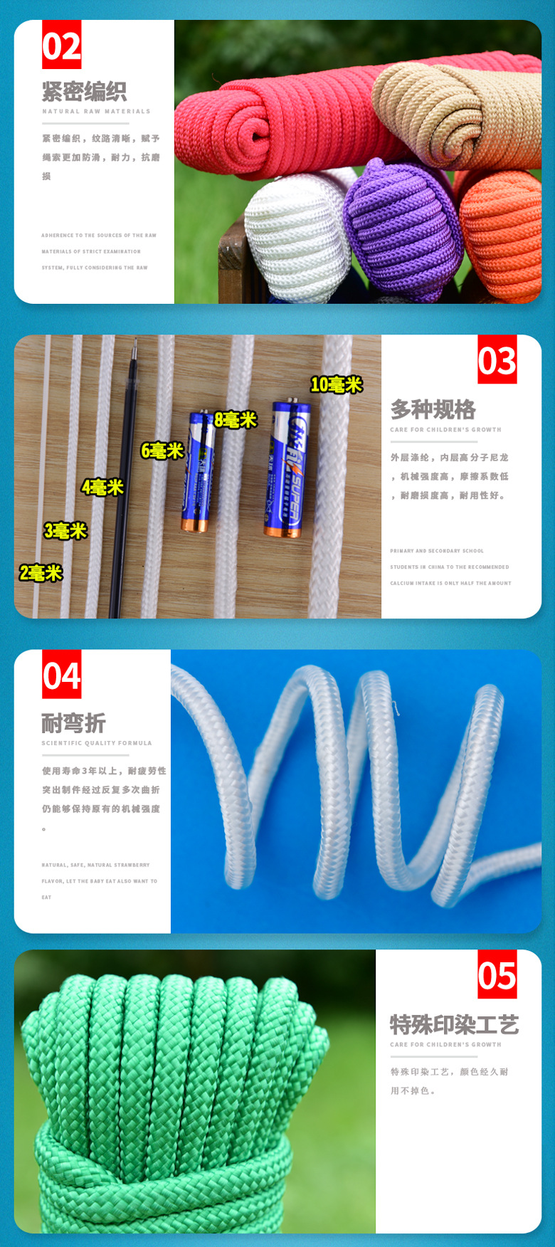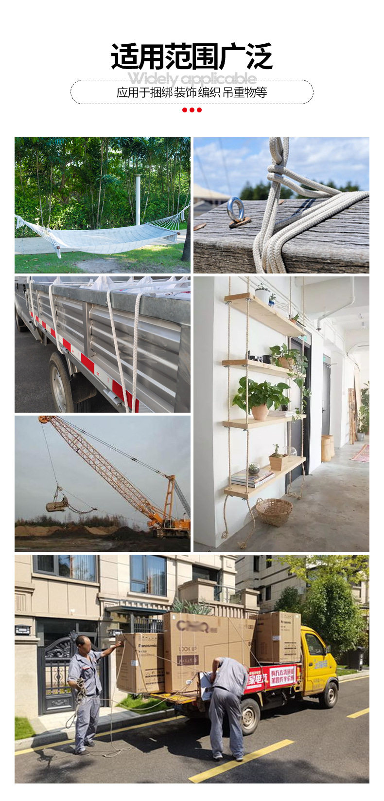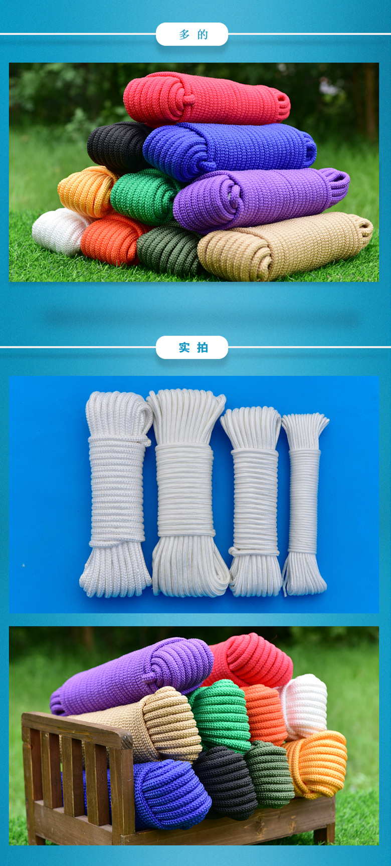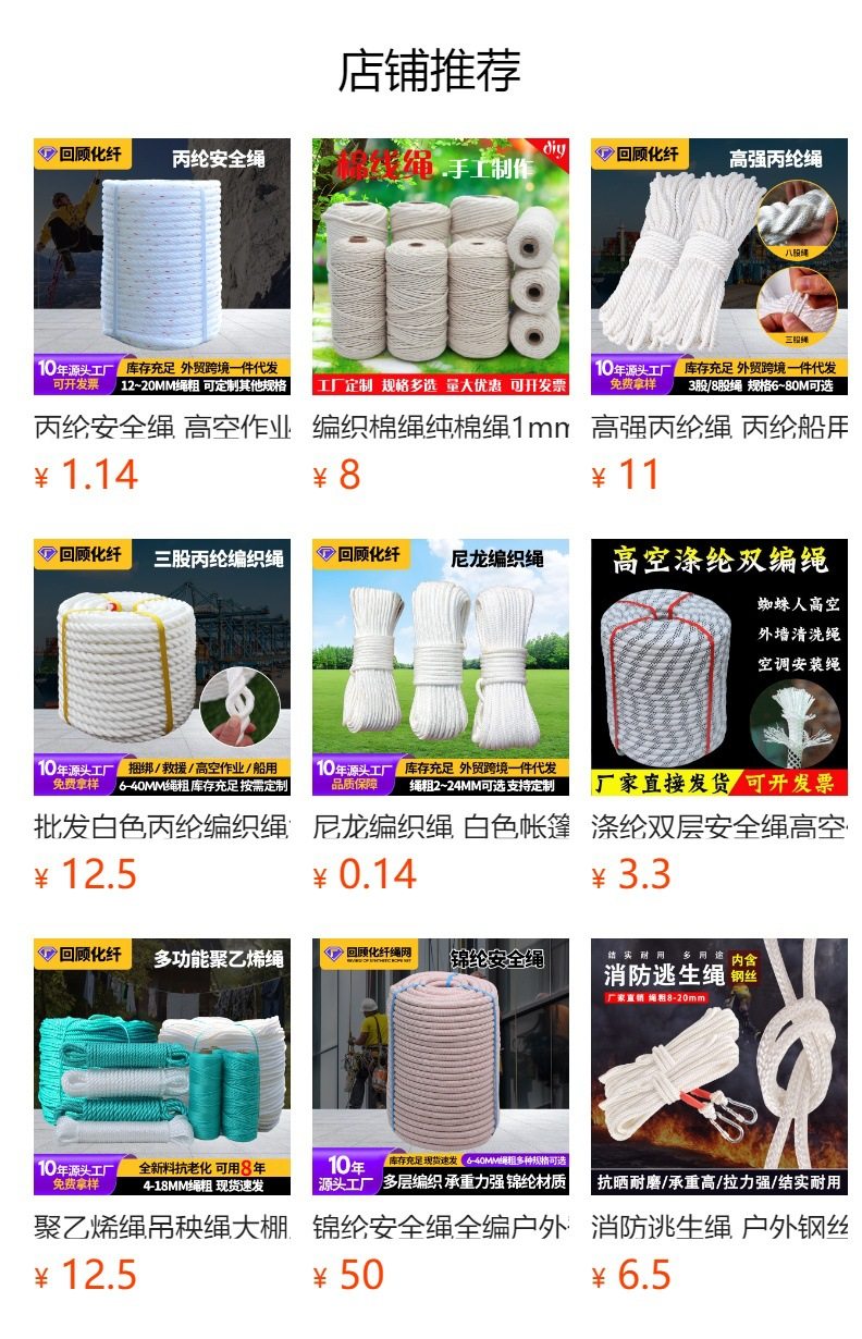 | Scope of application | Packaging,Decoration,SKIPPING ROPE,cross stitch,Outdoor,Outdoor Supplies,Tent wind rope,Drying clothes,Pendant rope,Gymnastics rope,Outdoor safety rope,Lifesaving Rope,Bundling,Industrial use,fishery industry,Military Fire Protection,Acid and alkali resistance, corrosion resistance, high temperature resistance, electrical insulation |