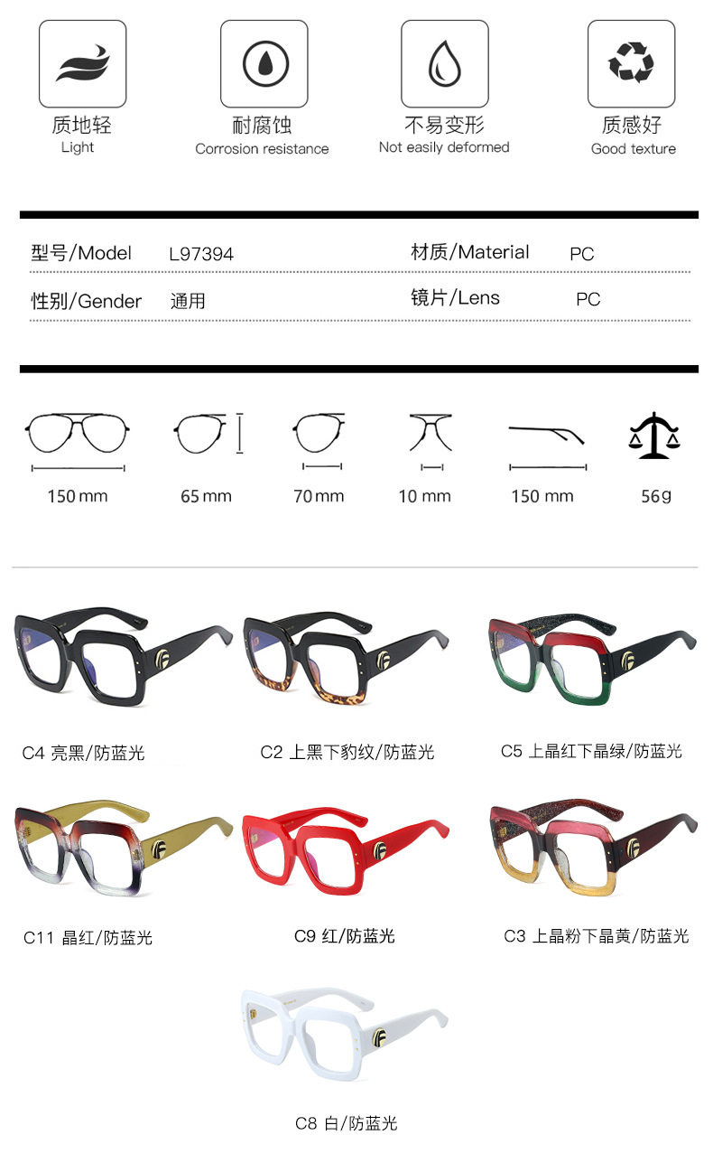 | Frame Color | C2 Upper Black and lower leopard print/anti-blue light,C4 bright black/anti-blue light,C5 Upper Crystal Red lower Crystal Green/anti-blue light |