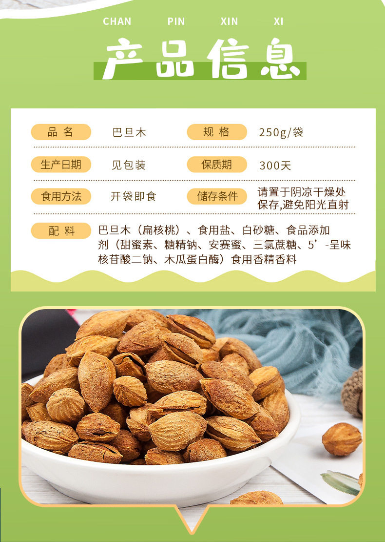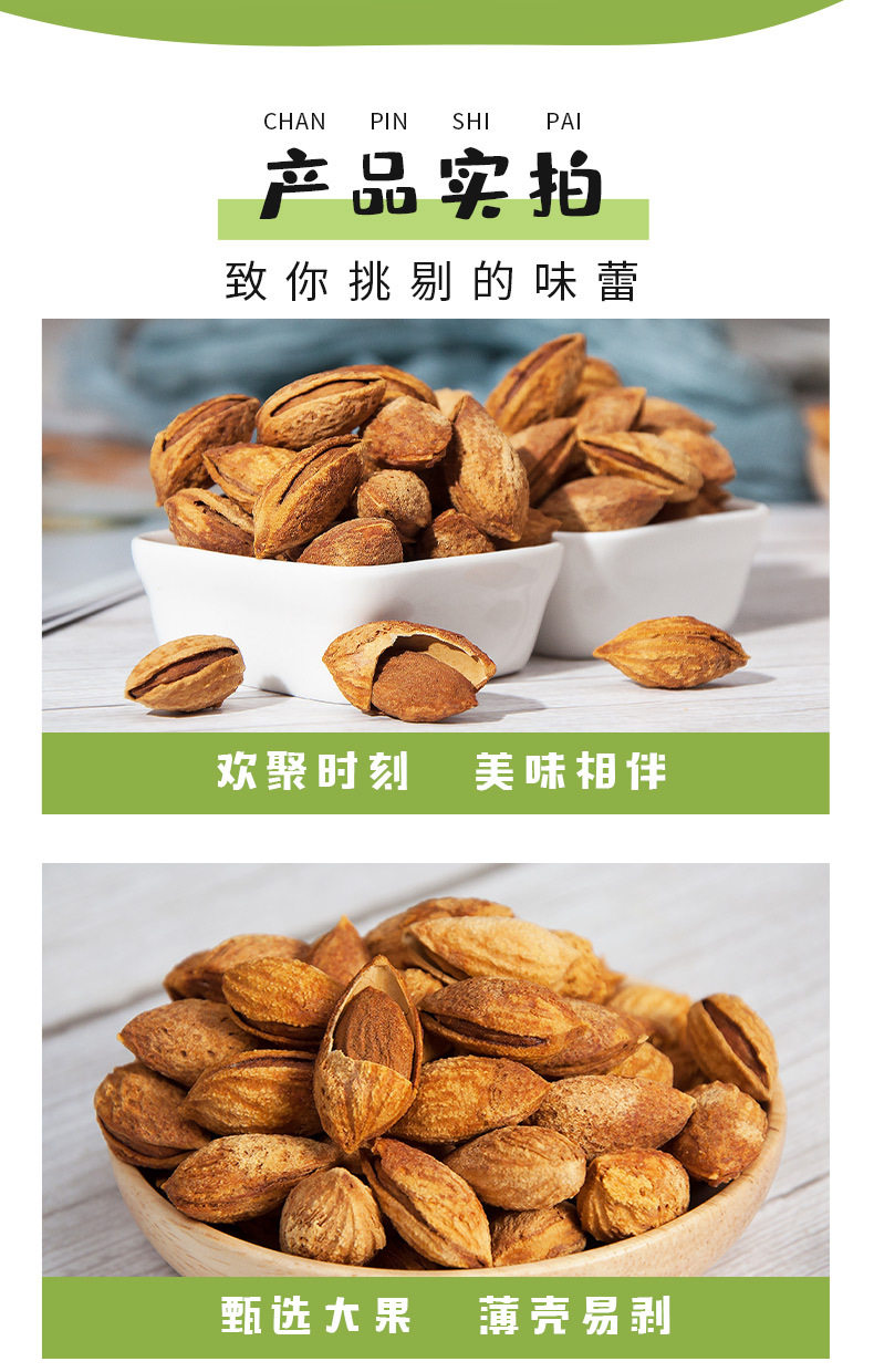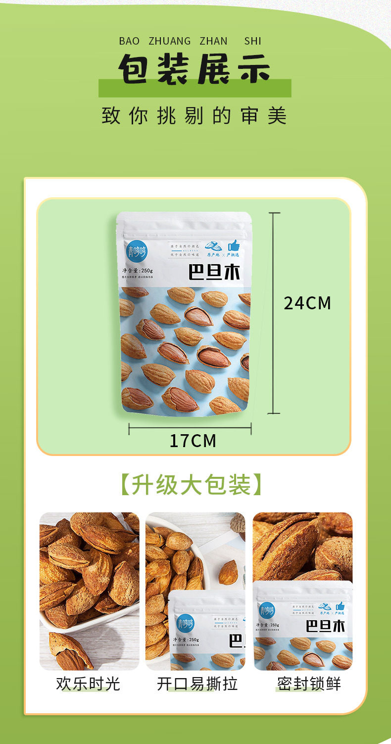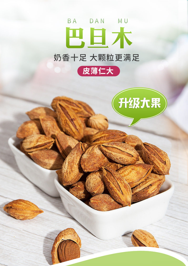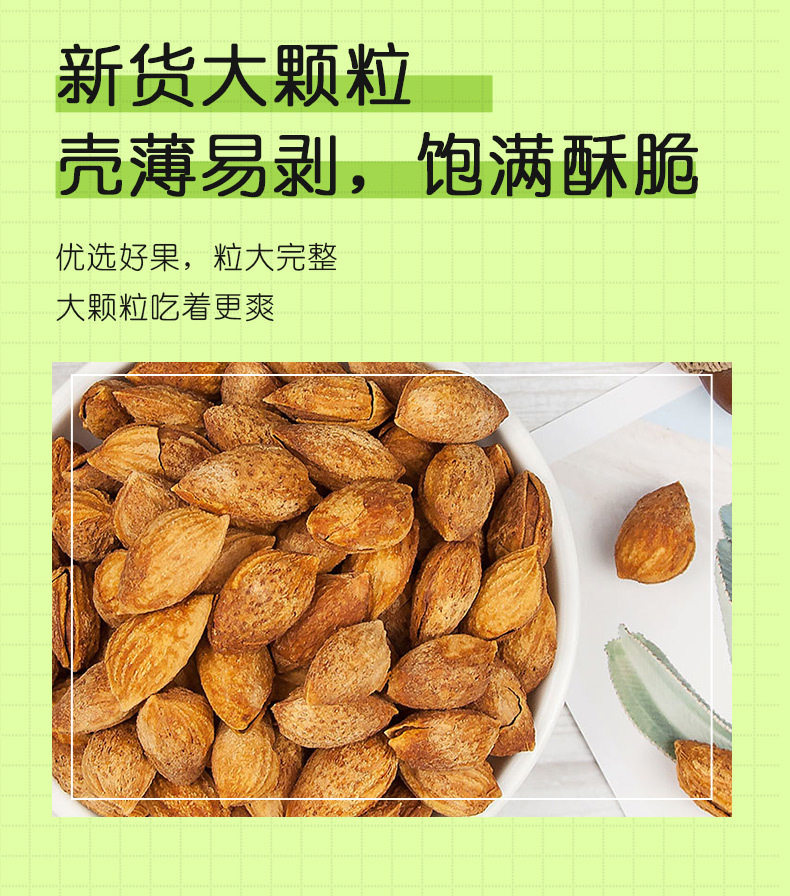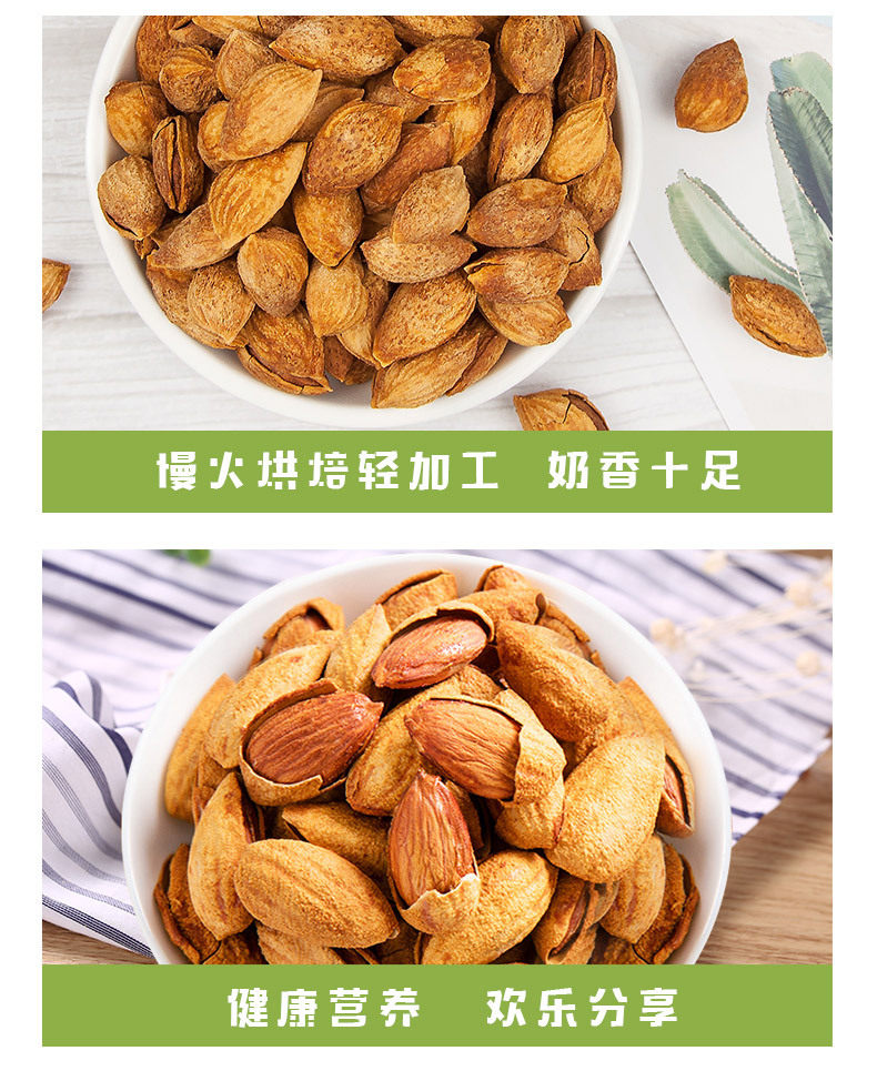 | Packaging specifications | Almonds 50g [thin shell, big mouth],Almonds 108g [thin shell, big mouth],Almonds 250g [thin shell, big mouth],Almonds canned 500g [thin shell, large mouth],Hawaiian fruit 108g,Happy fruit 108g,Pecan 108g,Charcoal roasted cashew nuts 108g,Milky walnuts 108g,Northeastern pine nuts 108g,Xiaobai xing 108g,Fried rice 108g,Broad beans 108g,Melon seeds 108g,Green beans 108g,Hawthorn strips 108g,Multi-flavor peanuts 108g,Crispy rice 100g,Red raisins 100g,Dried mango 108g,Banana slices 100g,Pull noodle balls 90g,Blackcurrant raisins 80g,Dried cranberries 80g |