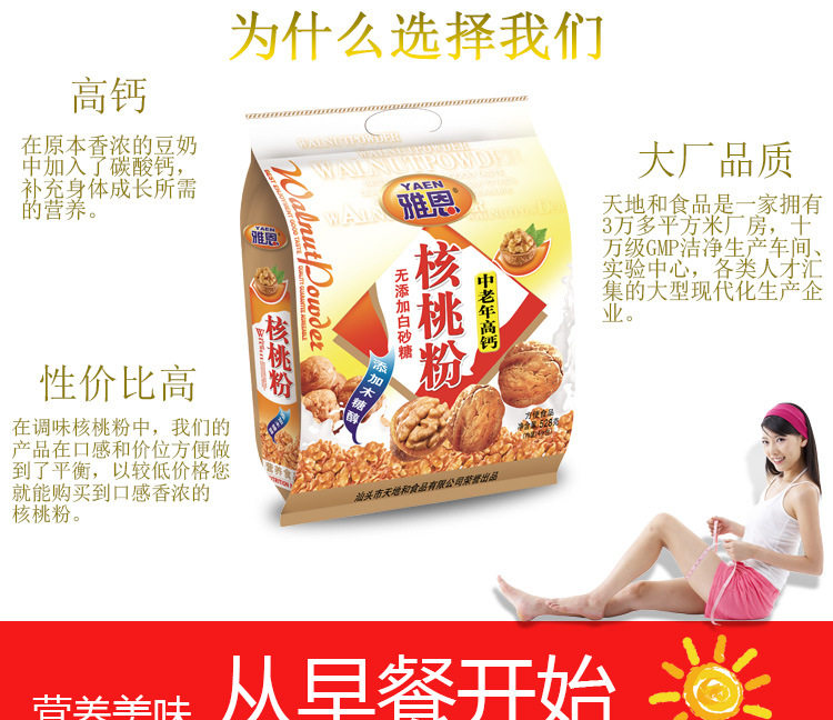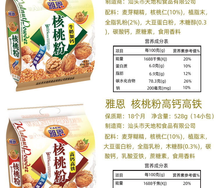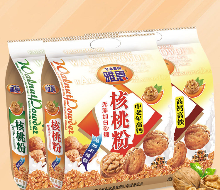 | Packaging specifications | Walnut powder [milk calcium added] 528 g/bag,Walnut powder [high calcium high speed rail] 528 g/bag,Walnut powder [middle-aged and elderly calcium added] 528 g/bag |