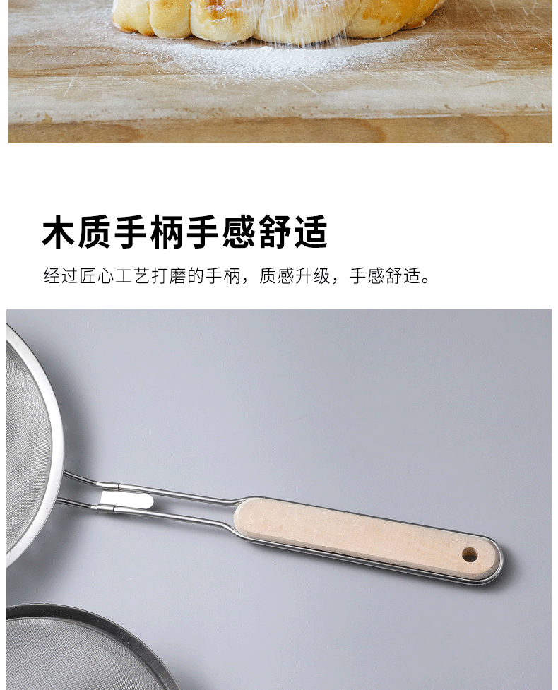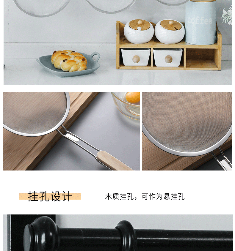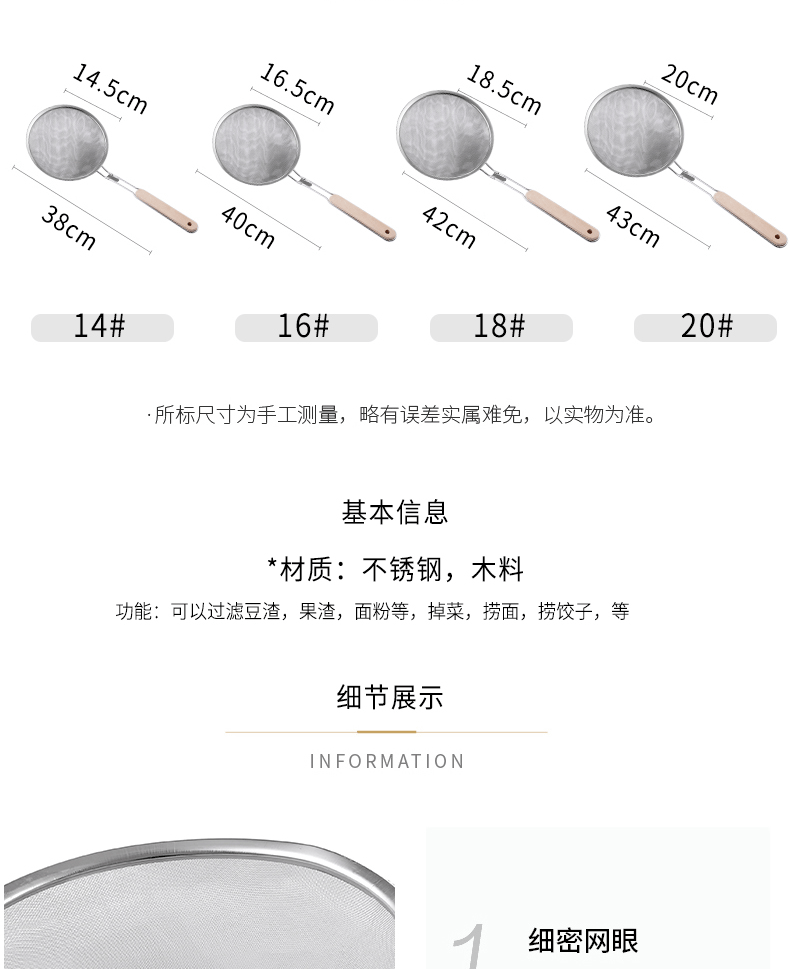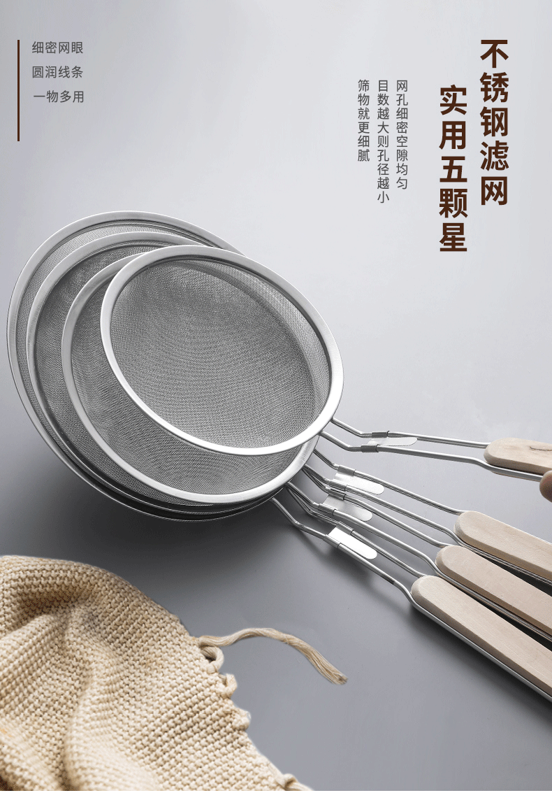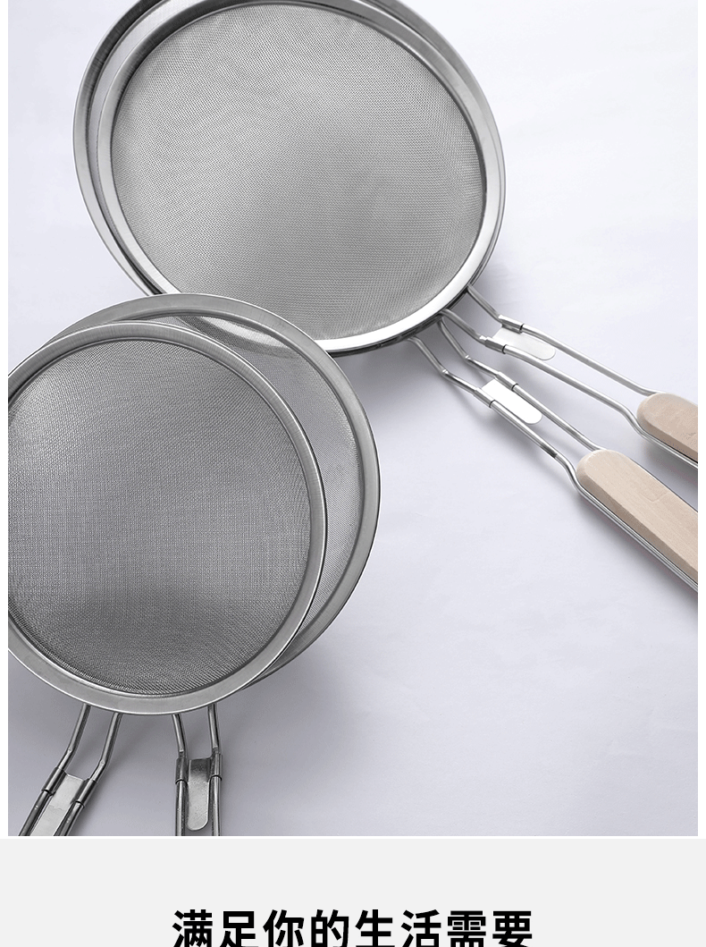 201 stainless steel colander wooden handle punching oil grid 40 mesh flour sieve baking tools Kitchen Dumpling fishing filter