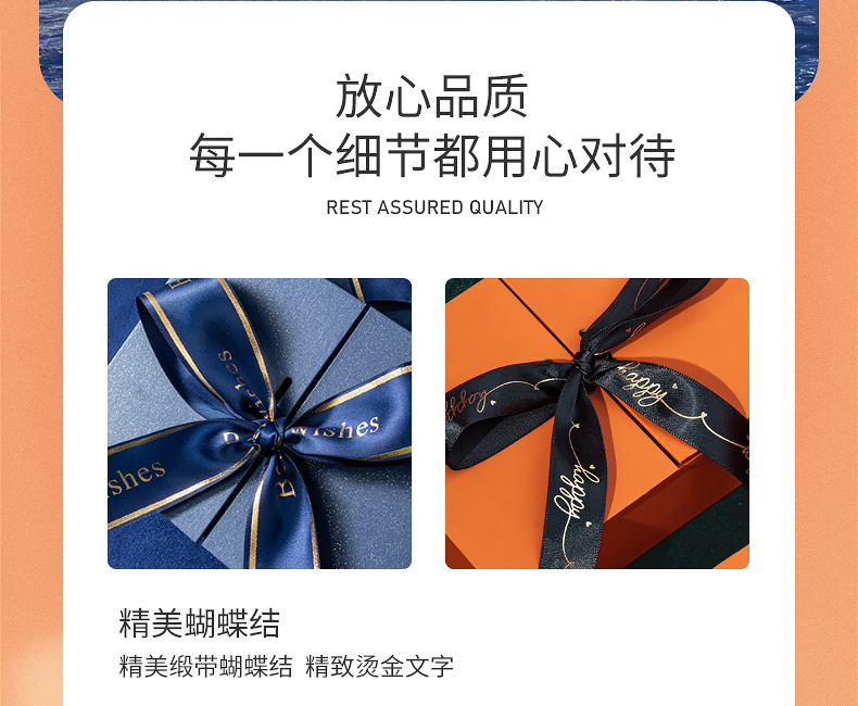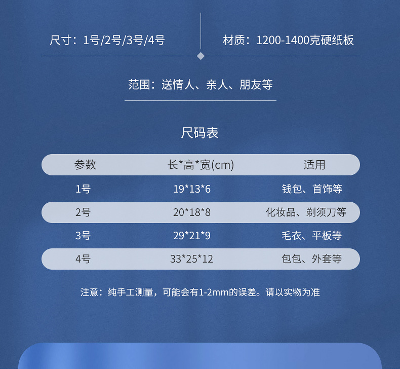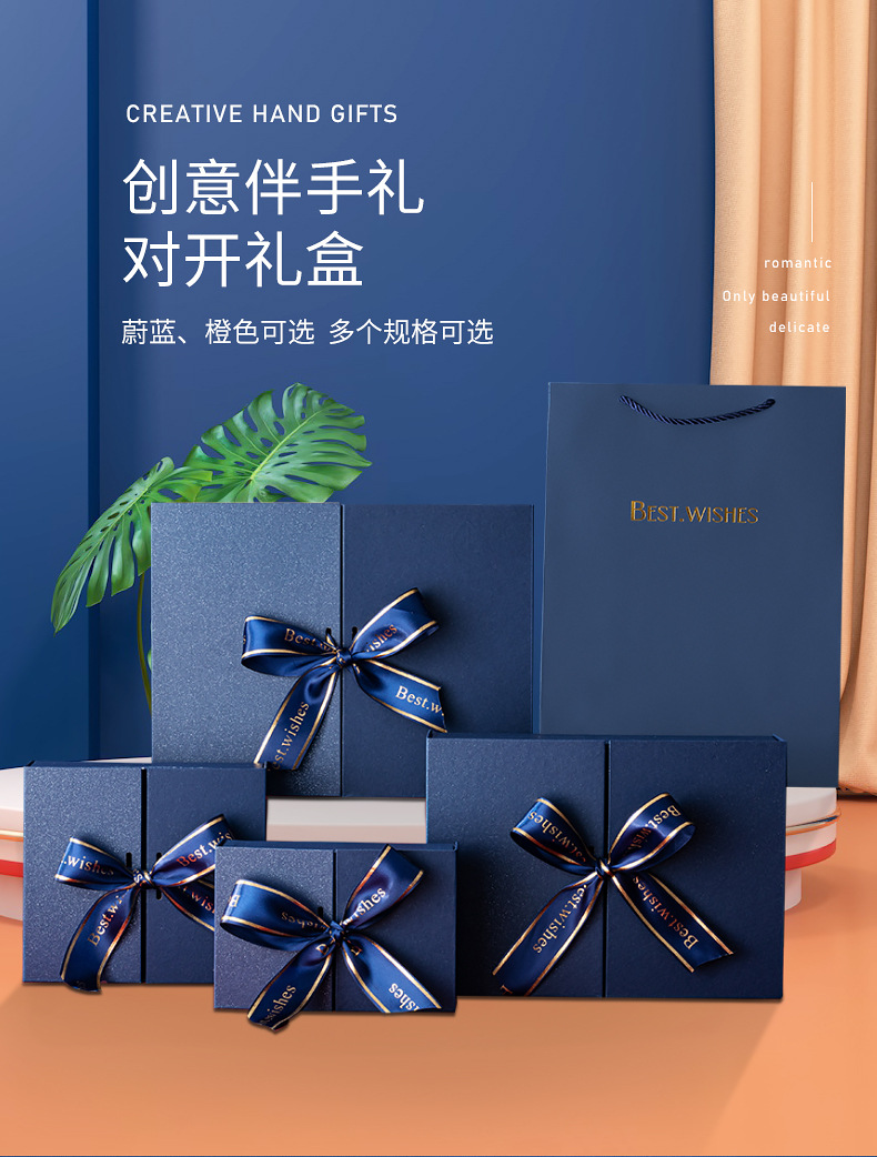 | Specifications and models | Blue split box; No. 1 box 19*13*6CM,Blue split box; No. 2 box 20*18*8CM,Blue split box; No. 3 box 29*21*9CM,Blue split box; No. 4 box 33*25*12CM,Blue split box; No. 1 and No. 2 handbags 19*9*22CM,Blue split box; No. 3 handbag 22*10*31CM,Blue split box; No. 4 bag 26*13*35CM,Blue split box; 10g raffia grass (color requires comments, no comments randomly sent),Blue split box; self-brightening atmosphere light,Orange split gift box; No. 1 box 19*13*6CM,Orange split gift box; Box 2 20*18*8CM,Orange split gift box; Box 3 29*21*9CM,Orange split gift box; No. 4 box 33*25*12CM,Orange split gift box; No. 1 and No. 2 handbags 19*9*22CM,Orange split gift box; No. 3 handbag 22*10*31CM,Orange split gift box; No. 4 handbag 26*13*35CM,Orange split gift box; 10g raffia grass (color requires comments, no comments randomly sent),Orange Halfway Gift Box; Self-Illuminated Ambient Light |
