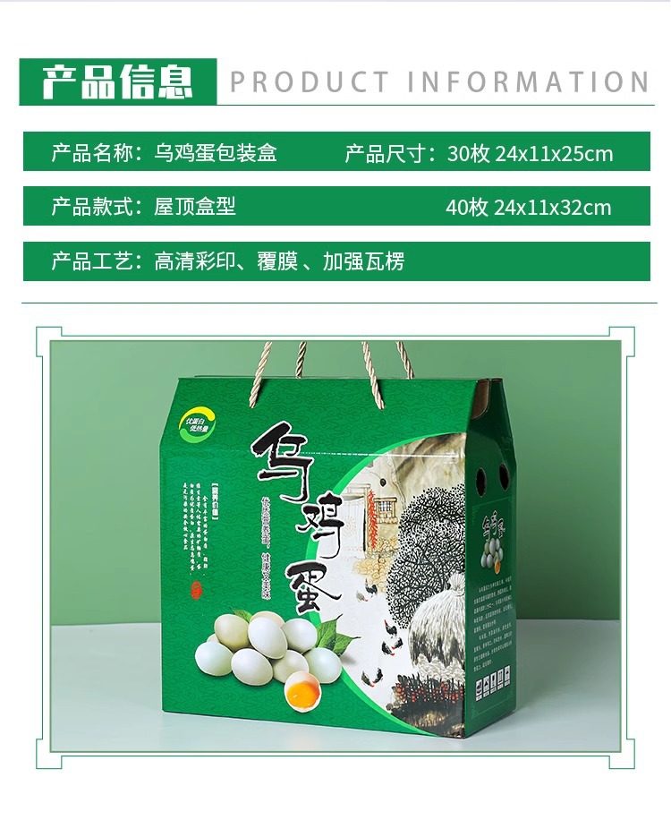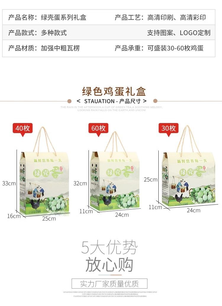 | Specifications and models | 30 green shell egg cartons (20 pieces); three layers of corrugated,30 green shell egg cartons + medium egg tray (20 sets); three layers of corrugated,40 green shell egg cartons (20 pieces); three layers of corrugated,40 green shell egg cartons + medium egg tray (20 sets); three layers of corrugated,60 green shell egg cartons (20 pieces); three layers of corrugated,60 green shell egg cartons + egg trays (20 sets); three layers of corrugated,30 green egg cartons (20 pieces); three layers of corrugated,30 green black egg cartons + medium egg tray (20 sets); three-layer corrugated,40 green egg cartons (20 pieces); three layers of corrugated,40 green black egg cartons + medium egg tray (20 sets); three-layer corrugated,Cowhide watermark green shell eggs 30 empty boxes (20 pieces); three layers of corrugated,Cowhide watermark green shell eggs 30 empty boxes + 3 egg trays (20 sets); three layers of corrugated,Cowhide watermark green shell eggs 40 pieces empty box (20 pieces); three layers of corrugated,Cowhide watermark green shell eggs 40 empty boxes + 4 egg trays (20 sets); three layers of corrugated,50 empty boxes of green-shelled eggs with cowhide watermark (20 pieces); three layers of corrugated,Cowhide watermark green shell eggs 50 empty boxes + 5 egg trays (20 sets); three layers of corrugated,Green printed green shell eggs 30 empty boxes (20 pieces); three layers of corrugated,Green color printed green shell eggs 30 empty boxes + 3 egg trays (20 sets); three layers of corrugated,Green printed green shell eggs 40 empty boxes (20 pieces); three layers of corrugated,Green color printed green shell eggs 40 empty boxes + 4 egg trays (20 sets); three layers of corrugated,Green printed green shell eggs 50 empty boxes (20 pieces); three layers of corrugated,Green color printed green shell eggs 50 empty boxes + 5 egg trays (20 sets); three layers of corrugated,Green printed green shell eggs 60 pieces empty box (20 pieces); three layers of corrugated,Green color printed green shell eggs 60 pieces empty box + 4 egg trays (20 sets); three layers of corrugated,30 empty boxes of colorful wild eggs (20 pieces); three layers of corrugated,30 colorful wild egg empty boxes + egg trays (20 sets); three-layer corrugated,40 empty boxes of colorful wild eggs (20 pieces); three layers of corrugated,40 colorful wild egg empty boxes + egg trays (20 sets); three-layer corrugated,50 empty boxes of colorful wild eggs (20 pieces); three layers of corrugated,50 colorful wild egg empty boxes + egg trays (20 sets); three layers of corrugated |