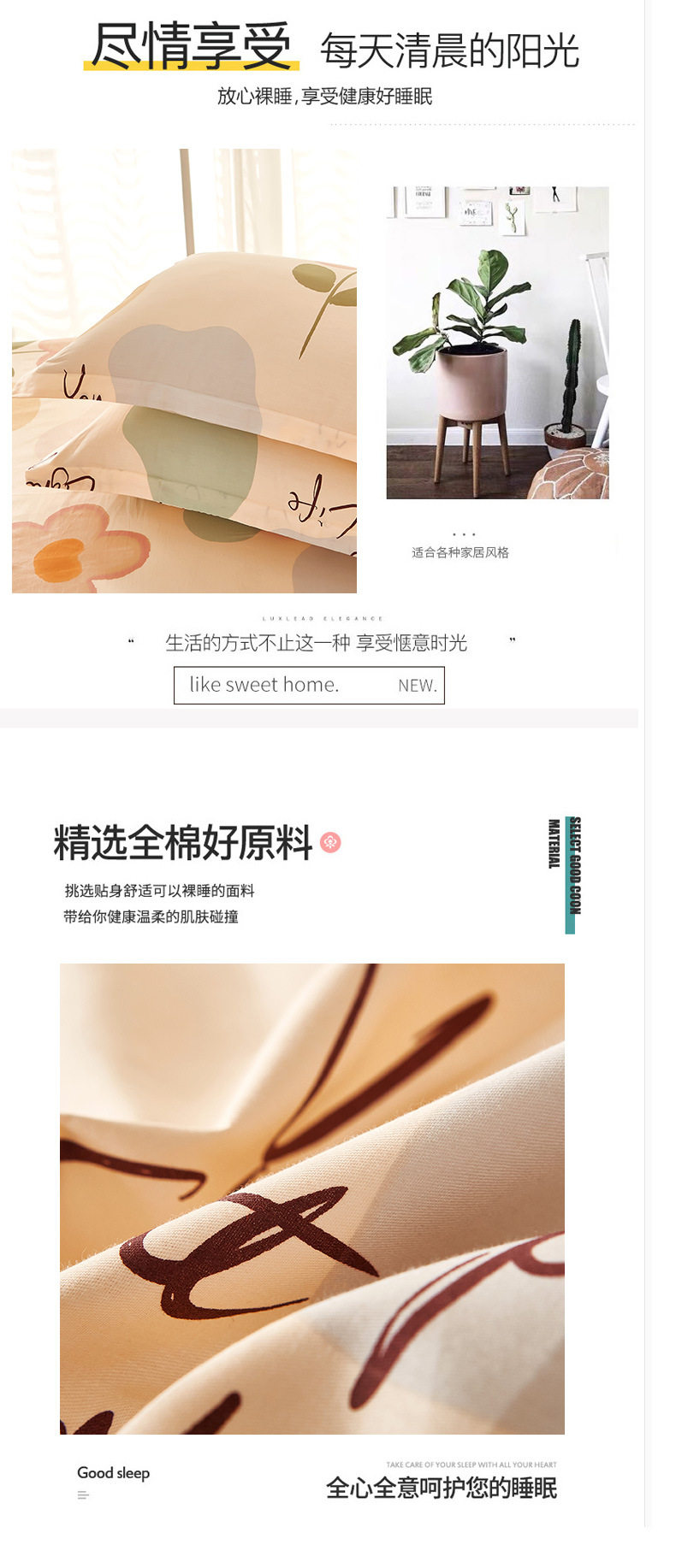 | Size specifications | 1.0m bed three-piece set (quilt cover 150x200 + sheets 160x230 + 1 pillowcase),1.2m bed three-piece set (quilt cover 160x210 + sheets 160x230 + 1 pillowcase),1.5m bed four-piece set (quilt cover 180x220 + sheets 200x230 + 2 pillowcases),1.8m bed four-piece set (quilt cover 200x230 + sheets 250x230 + 2 pillowcases),2.0m bed four-piece set (quilt cover 220x240 + sheets 250x230 + 2 pillowcases) |