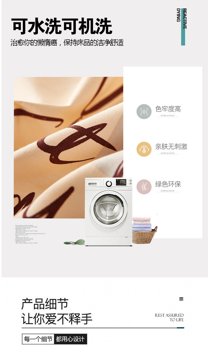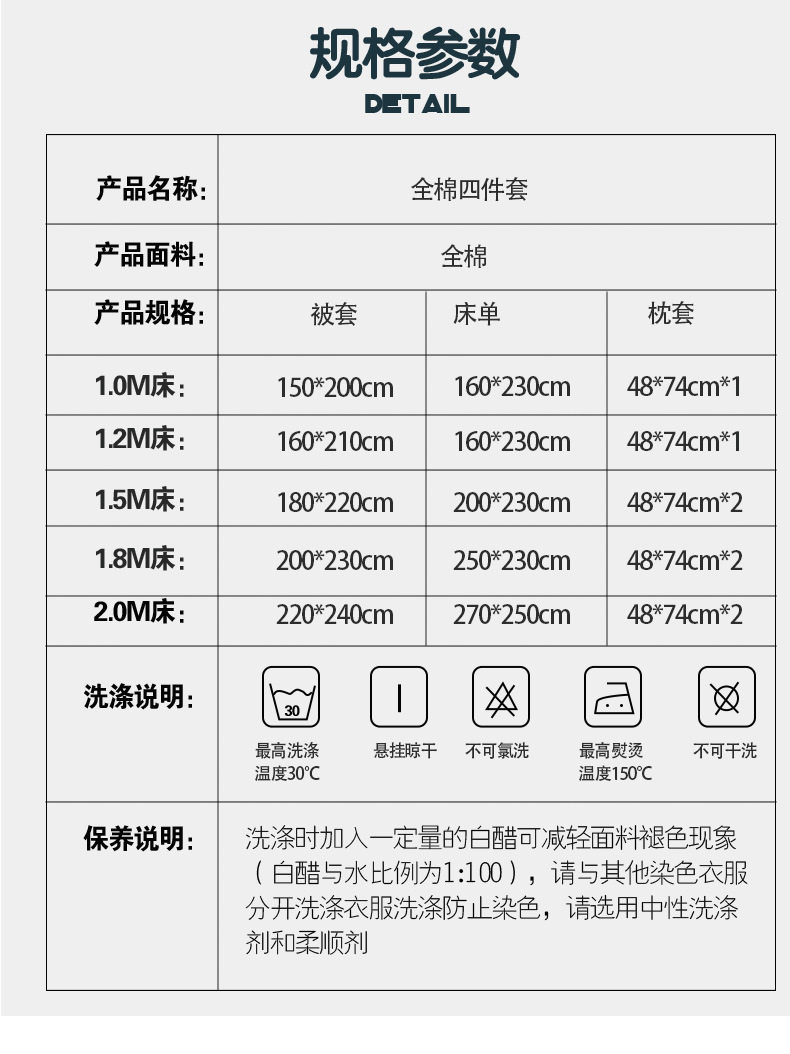 | Size specifications | 1.0m bed three-piece set (quilt cover 150x200 + sheets 160x230 + 1 pillowcase),1.2m bed three-piece set (quilt cover 160x210 + sheets 160x230 + 1 pillowcase),1.5m bed four-piece set (quilt cover 180x220 + sheets 200x230 + 2 pillowcases),1.8m bed four-piece set (quilt cover 200x230 + sheets 250x230 + 2 pillowcases),2.0m bed four-piece set (quilt cover 220x240 + sheets 250x230 + 2 pillowcases) |