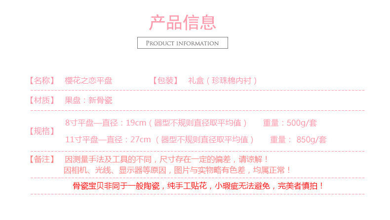 | Color | Cherry blossom Love 8-inch flat plate pink,Cherry blossom Love 8-inch flat plate Blue,Cherry blossom love 11-inch flat plate pink,Cherry blossom love 6-inch lace Bowl (General Box),Cherry blossom Love 9 bucket lace Bowl (General Box),Cherry blossom love 12-inch fish plate,Cherry blossom love 8.5 soup plate powder,Cherry blossom love 4.5-inch bowl powder (General Box),Cherry blossom love 8.5-inch nest plate Blue (General Box),Cherry blossom love 11-inch flat plate Blue (General Box) |