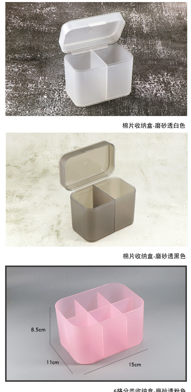 | Specifications | 6 compartment storage box-matte white,6-compartment storage box-powder,6-compartment storage box-Black,Large Tray-Frosted White,Large Tray-Pink,Large Tray-Black,Eyelash Storage Box-Frosted White,Eyelash Storage Box-Pink,Eyelash storage box-Black,Cotton Storage Box-Frosted White,Cotton storage box-powder,Cotton storage box-Black,Storage Cup-Frosted White,Storage Cup-Powder,Storage Cup-Black,Trumpet Tray-Frosted White,Trumpet Tray-Powder,Trumpet Tray-Black |
