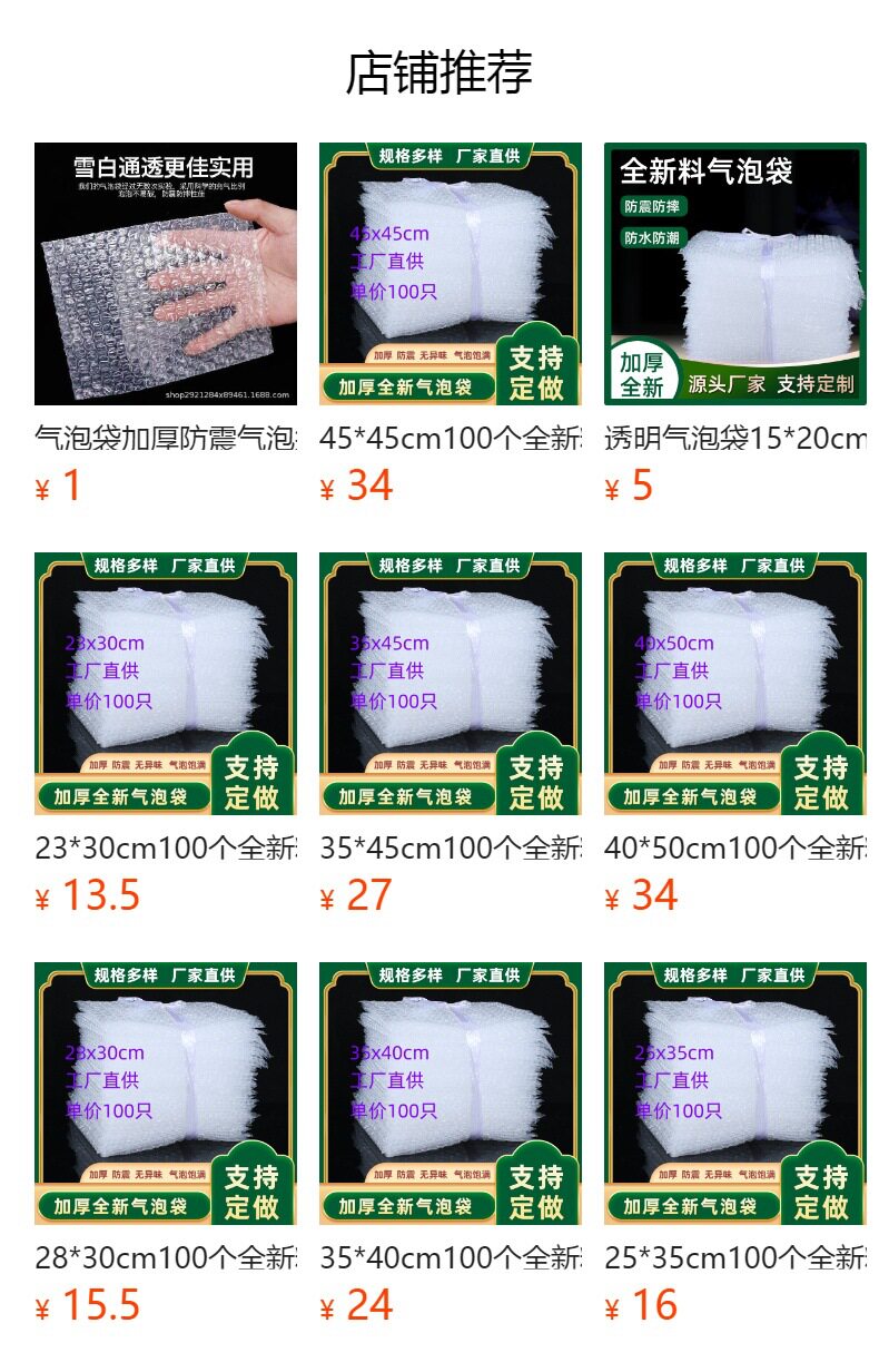 | Specifications and models | Spot bubble bags; 8*10cm (10 pieces); 0.05,Spot bubble bags; 10*15cm (10 pieces); 0.05,Spot bubble bag; 13*15cm (5 pieces); 0.05,Spot bubble bag; 10*20cm (5 pieces); 0.05,Spot bubble bag; 13*20cm (1 piece); 0.05,Spot bubble bag; 15*20cm (1 piece); 0.05,Spot bubble bag; 18*20cm (1 piece); 0.05,Spot bubble bag; 13*25cm (1 piece); 0.05,Spot bubble bag; 15*25cm (1 piece); 0.05,Spot bubble bag; 17*25cm (1 piece); 0.05,Spot bubble bag; 20*25cm (1 piece); 0.05,Spot bubble bag; 23*25cm (1 piece); 0.05,Spot bubble bag; 15*30cm (1 piece); 0.05,Spot bubble bag; 18*30cm (1 piece); 0.05,Spot bubble bag; 20*30cm (1 piece); 0.05,Spot bubble bag; 23*30cm (1 piece); 0.05,Spot bubble bag; 25*30cm (1 piece); 0.05,Spot bubble bag; 28*30cm (1 piece); 0.05,Spot bubble bag; 25*35cm (1 piece); 0.05,Spot bubble bag;30*35cm (1 piece);0.05,Spot bubble bag; 30*40cm (1 piece); 0.05,Spot bubble bag; 35*40cm (1 piece); 0.05,Spot bubble bag; 35*45cm (1 piece); 0.05,Spot bubble bag; 45*45cm (1 piece); 0.05,Spot bubble bag; 40*50cm (1 piece); 0.05,Spot bubble bag; 40*45cm (1 piece); 0.05 |