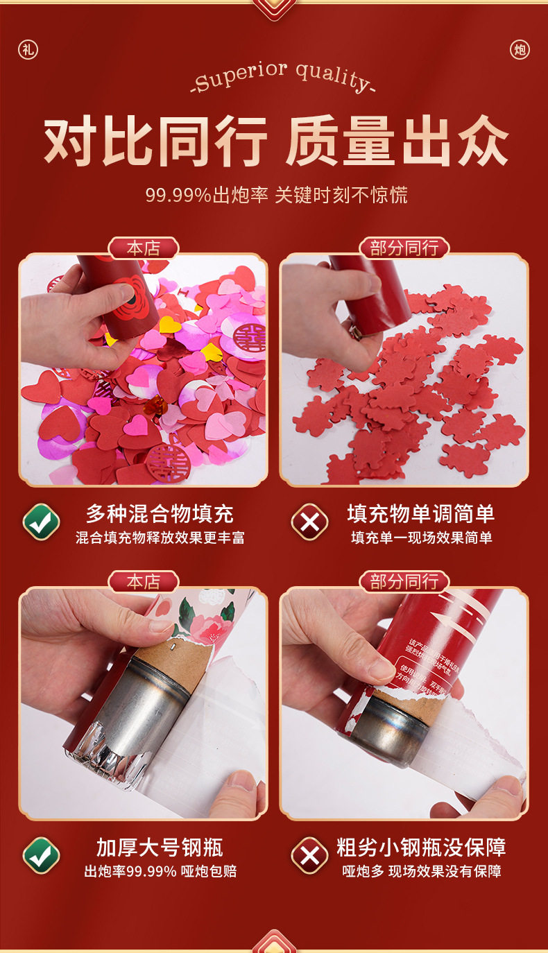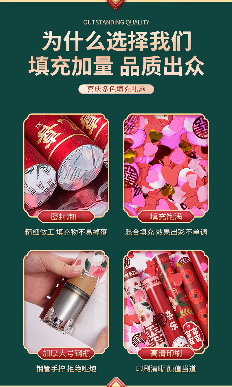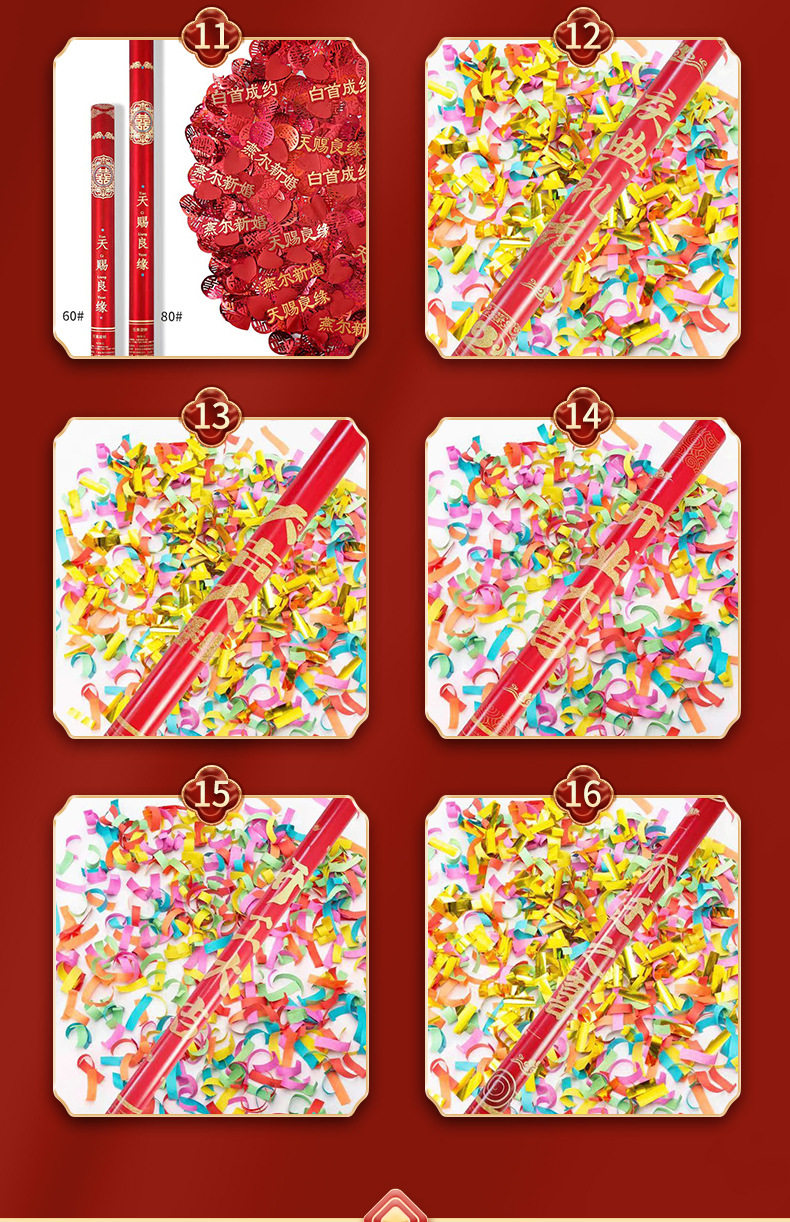 | Variety | 40#Appointment with rose (red petals)#All dumb cannonball guarantees#,60#Popular small fragrance series (random delivery),60 # New painted dopamine series [8000 pieces] (random delivery in outer packaging),60#Rose gold galaxy brilliance [recommended index 10 stars],60#Martha red: eternal love [recommended: 10 stars],80#Petal rain (pink) 10,000 pieces [recommendation index 10 stars],80#Petal rain (red) 10,000 pieces [recommendation index 10 stars],60#Electric silver ribbon salute (hot model),80#New painted series [12,000 pieces] (random delivery in outer packaging),60#Pastoral style my family youxi (love + yuanxi + blessing card) 2024 new style,60#Pastoral style pink joy (love + joy + blessing card) 2024 new style,60#Pastoral style sweet little life (love + happiness + blessing card) 2024 new style,80 # Rose gold starry sky (full of pictures),80#Eternal love (full of atmosphere),80#Double volume version of the popular small fragrance series (shipped randomly),60#Daxi (2024 french style series),60#Happy events at home (2024 french style series),60#Big day (special craft paper) 2024 new style,60#Gypsophila daxi (special craft paper) 2024 new style,60#My family youxi (special craft paper) 2024 new style,60#Happy wedding (love + happiness + happy wedding),60#My family is happy (high-end love + happiness),60#My family is happy (love + happiness),60#Double happiness (petals + love + happiness),60#Light luxury style big day (various fillings),60#Light luxury style (various fillings),60#Light luxury style, my family is happy (various fillings),60#Appointment with rose (5000 red petals),80#Electric silver ribbon salute (upgraded version with 2 times more quantity),80#Grand joy (french chic collection),80#Joyful occasions (french chic collection),60#Glitter frosted dragon and phoenix (added with various fillings),60#Glitter frosted happy wedding (add multiple fillings),60#Glitter frosted joy (add more fillings),60#Glitter frosted wedding day (add more fillings),60#Glitter frosted good luck (various fillings),60#Glitter frosting starts well (various fillings),60#Glitter frosted housewarming (various fillings),60#Glitter frosted opening day (multiple fillings),60#Happy wedding (pure red heart),60#Good luck in starting work (special drawing process),80#Good luck in starting work (special drawing process),60#Happy opening (special drawing process),80#Happy opening (special drawing process),60#Good luck with the start of work (colored paper + gold bars),60#Laser good luck (add more fillings) is suitable for all occasions,80#Good luck (color strips + sequins),80#Celebration fireworks (high-end color strips),80#Laser good luck (add more fillings) is suitable for all occasions,60#Double happiness (high-quality color roll + happy word) without debris,80#Pastoral style my family youxi (love + yuanxi + blessing card) 2024 new style,80#Happy wedding (love + happiness + happy wedding),80#Glitter frosted wedding day (add more fillings),80#Big day (special craft paper) 2024 new style,80#My family youxi (special craft paper) 2024 new style,80#Gypsophila daxi (special craft paper) 2024 new style,80#My family is happy (high-quality color roll + happy word) without any debris,80#My family is happy (love + happiness),80#Light luxury style, my family is happy (various fillings),80#Light luxury style big day (various fillings),80#Light luxury style (various fillings),80#Light luxury style joy (various fillings),80#Glitter frosted happy wedding (add multiple fillings),80 # Glitter frosted good luck (various fillings),80#Glitter frosting starts well (various fillings),80#Glitter frosted housewarming (various fillings),80#Glitter frosted opening day (multiple fillings),80#Good luck with the start of work (colored paper + gold bars),80#Laser gold good luck (high quality colored paper without debris),80#Laser gold starts work (high quality gold foil strips),40#Universal style of celebration fireworks (colored paper + gold bars),40#Good luck (colored paper) special price#Universal model#,40#Happy wedding (pure red heart) |