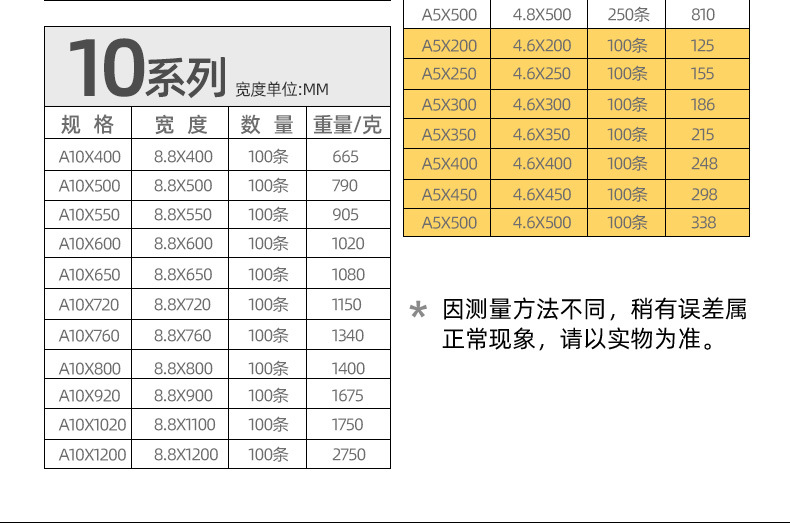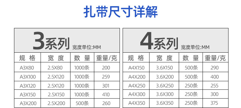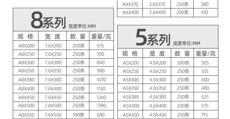 | Specifications and models | White; Non-standard 3*100 [real width 1.8mm] [1000 strips/bag]],White; Non-standard 3*120 [real width 2.0mm]],White; Non-standard 3*150 [real width 1.8mm] [1000 strips/bag]],White; Non-standard 3*200 [real width 2.0mm] [500 strips/bag]],White; National standard 3*100 [real width 2.5mm] [1000 strips/bag]],White; National standard 3*120 [real width 2.5mm] [1000 strips/bag]],White; National standard 3*150 [real width 2.5mm] [1000 strips/bag]],White; National standard 3*200 [real width 2.5mm] [500 strips/bag]],White; Non-standard 4*150 [real width 2.7mm] [500 strips/bag]],White; Non-standard 4*200 [real width 2.7mm] [500 strips/bag]],White; Non-standard 4*250 [real width 2.7mm] [250 strips/bag]],White; Non-standard 4*300 [real width 2.7mm] [250 strips/bag]],White; National standard 4*150 [real width 3.6mm] [500 strips/bag]],White; National standard 4*200 [real width 3.6mm] [500 strips/bag]],White; National standard 4*250 [real width 3.6mm] [250 strips/bag]],White; National standard 4*300 [real width 3.6mm] [250 strips/bag]],White; National standard 4*350 [real width 3.6mm] [250 strips/bag]],White; National standard 4*400 [real width 3.6mm] [250 strips/bag]],White; National standard 5*200 [real width 4.8mm] [500 strips/bag]],White; National standard 5*250 [real width 4.8mm] [250 strips/bag]],White; National standard 5*300 [real width 4.8mm] [250 strips/bag]],White; National standard 5*350 [real width 4.8mm] [250 strips/bag]],White; National standard 5*400 [real width 4.8mm] [250 strips/bag]],White; National standard 5*450 [real width 4.8mm] [250 strips/bag]],White; National standard 5*500 [real width 4.8mm] [250 strips/bag]],White; Non-standard 8*200 [real width 5.0mm] [500 strips/bag]],White; Non-standard 8*250 [real width 5.0mm] [250 strips/bag]],White; Non-standard 8*300 [real width 5.0mm] [250 strips/bag]],White; Non-standard 8*350 [real width 5.0mm] [250 strips/bag]],White; Non-standard 8*400 [real width 5.2mm] [250 strips/bag]],White; Non-standard 8*500 [real width 5.2mm] [250 strips/bag]],White; National standard 8*200 [real width 7.6mm] [250 strips/bag]],White; National standard 8*250 [real width 7.6mm] [250 strips/bag]],White; National standard 8*300 [real width 7.6mm] [100 strips/bag]],White; National standard 8*350 [real width 7.6mm] [250 strips/bag]],White; National standard 8*400 [real width 7.6mm] [250 strips/bag]],White; National standard 8*450 [real width 7.6mm] [250 strips/bag]],White; National standard 8*500 [real width 7.6mm] [100 strips/bag]],White; National standard 8*550 [real width 7.6mm] [100 strips/bag]],White; National standard 10*500 [real width 9.0mm] [100 strips/bag]],White; National standard 10*550 [real width 9.0mm] [100 strips/bag]],White; National standard 10*600 [real width 9.0mm] [100 strips/bag]],White; National standard 10*650 [real width 9.0mm] [100 strips/bag]],White; National standard 10*700 [real width 9.0mm] [100 strips/bag]],White; National standard 10*800 [real width 9.0mm] [100 strips/bag]],White; National standard 10*900 [real width 9.0mm] [100 strips/bag]],White; National standard 10*1000 [real width 9.0mm] [100 strips/bag,White; National standard 10*1200 [real width 9.0mm] [50/bag]],White; National standard 10*1500 [real width 9.0mm] [50/bag]],Black; Non-standard 3*100 [real width 1.8mm] [1000 strips/bag]],Black; Non-standard 3*120 [real width 2.0mm]],Black; Non-standard 3*150 [real width 1.8mm] [1000 strips/bag]],Black; Non-standard 3*200 [real width 2.0mm] [500 strips/bag]],Black; National standard 3*100 [real width 2.5mm] [1000 strips/bag]],Black; National standard 3*120 [real width 2.5mm] [1000 strips/bag]],Black; National standard 3*150 [real width 2.5mm] [1000 strips/bag]],Black; National standard 3*200 [real width 2.5mm] [500 strips/bag]],Black; Non-standard 4*150 [real width 2.7mm] [500 strips/bag]],Black; Non-standard 4*200 [real width 2.7mm] [500 strips/bag]],Black; Non-standard 4*250 [real width 2.7mm] [250 strips/bag]],Black; Non-standard 4*300 [real width 2.7mm] [250 strips/bag]],Black; National standard 4*150 [real width 3.6mm] [500 strips/bag]],Black; National standard 4*200 [real width 3.6mm] [500 strips/bag]],Black; National standard 4*250 [real width 3.6mm] [250 strips/bag]],Black; National standard 4*300 [real width 3.6mm] [250 strips/bag]],Black; National standard 4*350 [real width 3.6mm] [250 strips/bag]],Black; National standard 4*400 [real width 3.6mm] [250 strips/bag]],Black; National standard 5*200 [real width 4.8mm] [500 strips/bag]],Black; National standard 5*250 [real width 4.8mm] [250 strips/bag]],Black; National standard 5*300 [real width 4.8mm] [250 strips/bag]],Black; National standard 5*350 [real width 4.8mm] [250 strips/bag]],Black; National standard 5*400 [real width 4.8mm] [250 strips/bag]],Black; National standard 5*450 [real width 4.8mm] [250 strips/bag]],Black; National standard 5*500 [real width 4.8mm] [250 strips/bag]],Black; National standard 5*600 [real width 4.8mm] [250 strips/bag]],Black; Non-standard 8*200 [real width 5.0mm] [500 strips/bag]],Black; Non-standard 8*250 [real width 5.0mm] [250 strips/bag]],Black; Non-standard 8*300 [real width 5.0mm] [250 strips/bag]],Black; Non-standard 8*350 [real width 5.0mm] [250 strips/bag]],Black; Non-standard 8*400 [real width 5.2mm] [250 strips/bag]],Black; Non-standard 8*500 [real width 5.2mm] [250 strips/bag]],Black; National standard 8*200 [real width 7.6mm] [250 strips/bag]],Black; National standard 8*250 [real width 7.6mm] [250 strips/bag]],Black; National standard 8*300 [real width 7.6mm] [100 strips/bag]],Black; National standard 8*350 [real width 7.6mm] [250 strips/bag]],Black; National standard 8*400 [real width 7.6mm] [250 strips/bag]],Black; National standard 8*450 [real width 7.6mm] [250 strips/bag]],Black; National standard 8*500 [real width 7.6mm] [100 strips/bag]],Black; National standard 8*550 [real width 7.6mm] [100 strips/bag]],Black; National standard 10*500 [real width 9.0mm] [100 strips/bag]],Black; National st