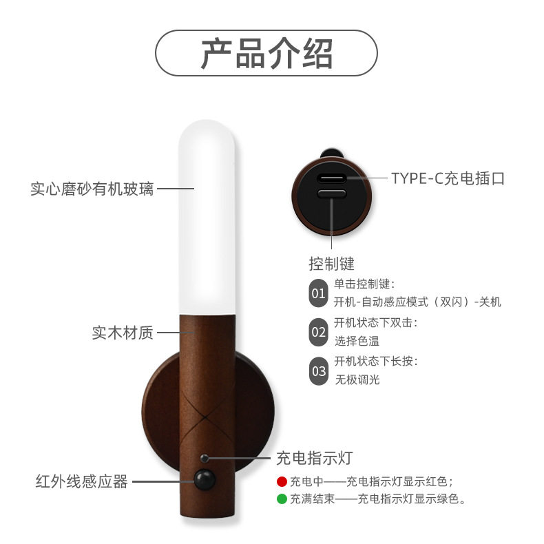 USB charging smart human body induction lamp wireless bedside wardrobe night light solid wood cabinet lamp entrance desk lamp