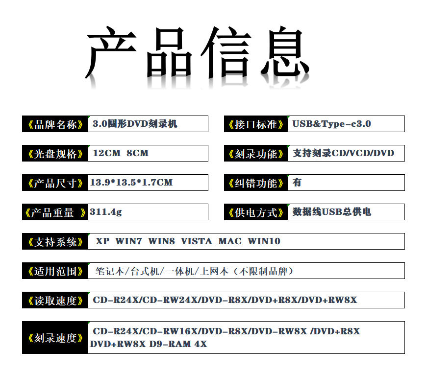 | Reading disc format | CD-R, CD-RWCD-ROM, CD-DA; 8x: DVD-ROM, DVD+/-R,DVD |