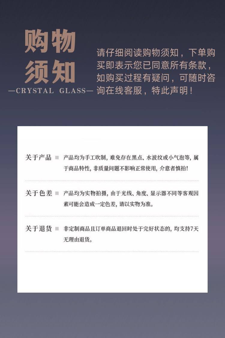| Specifications and dimensions | Amber black lightning pattern,Amber red lightning pattern,Amber blue lightning pattern,Amber green lightning pattern,Three sets of color blue lightning patterns,Transparent blue lightning pattern,Transparent red lightning pattern,Pink lightning pattern,Three sets of color gray distant thunder,Three sets of color gray thunder light,Three sets of gray colors, fenghua snow moon,Three sets of gray rime,Amber green flowing water dragon eye pattern,Amber blue flowing dragon eye pattern,Amber black flowing dragon eye pattern,Amber red flowing dragon eye pattern,Amber green polka dot chrysanthemum,Amber blue polka dot chrysanthemum,Amber black polka dot chrysanthemum,Amber red polka dot chrysanthemum,Amber red peacock with open tail,Amber green peacock in full bloom,Amber blue peacock with open tail,Amber black peacock in full bloom,Gray flame,9592 gray flame,Amber red daisy,Amber green daisy,Amber blue daisy,Amber black daisy,Blue daisy,9592 blue daisy,Blue dawn,Purple dawn,Green dawn,Purple fluorite,Blue fluorite,Green fluorite,Black fluorite,Pink fluorite,Purple moon rainbow,Gray moon rainbow,Amber black darth vader,New version of black warrior,Eye of god,Black butterfly,Purple butterfly,Pink chrysanthemum,Purple peacock,Purple thousand sails,Blue thousand sails,Pink thousand sails,Lead-free crystal barley pattern |