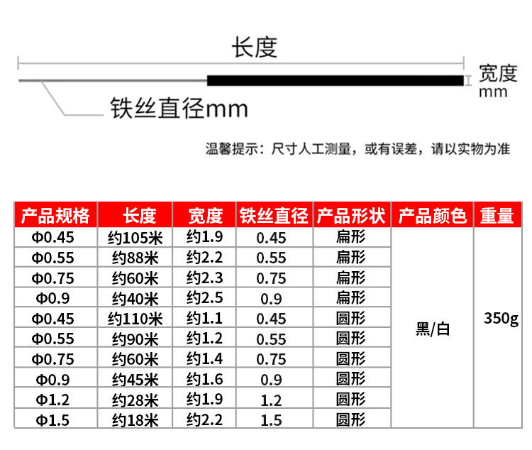 | Specification model | [iron core 0.45mm] flat/approx. 105m ; white,[iron core 0.45mm] flat/approx. 105m ; black,[iron core 0.45mm] round/approx. 110m ; white,[iron core 0.45mm] round/approx. 110m ; black,[iron core 0.55mm] flat/approx. 90m ; white,[iron core 0.55mm] flat/approx. 90m ; black,[iron core 0.55mm] round/approx. 90m ; white,[iron core 0.55mm] round/approx. 90m ; black,[iron core 0.75mm] flat/approx. 62m ; white,[iron core 0.75mm] flat/approx. 62m ; black,[iron core 0.75mm] round/approx. 68m ; white,[iron core 0.75mm] round/approx. 68m ; black,[iron core 0.9mm] flat/approx. 40m ; white,[iron core 0.9mm] flat/approx. 40m ; black,[iron core 0.9mm] round/approx. 45m ; white,[iron core 0.9mm] round/approx. 45m ; black,[iron core 1.2mm] round/approx. 28m ; white,[iron core 1.2mm] round/approx. 28m ; black,[iron core 1.5mm] round/approx. 18m ; white,[iron core 1.5mm] round/approx. 18m ; black |