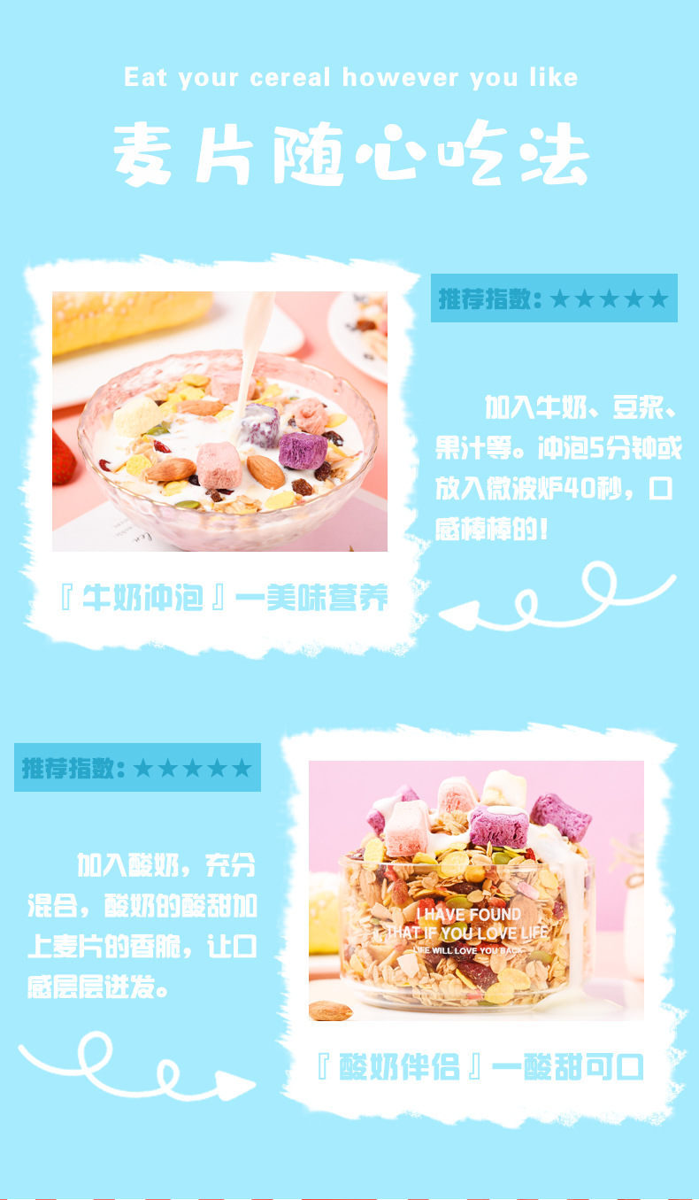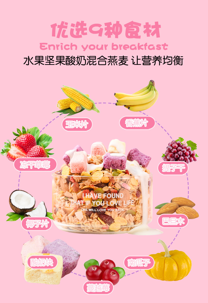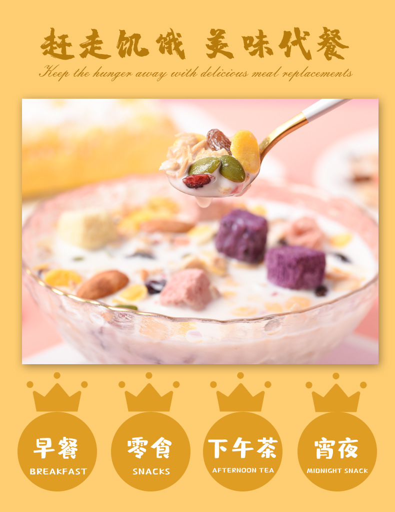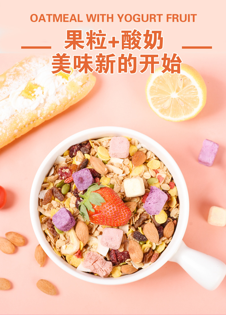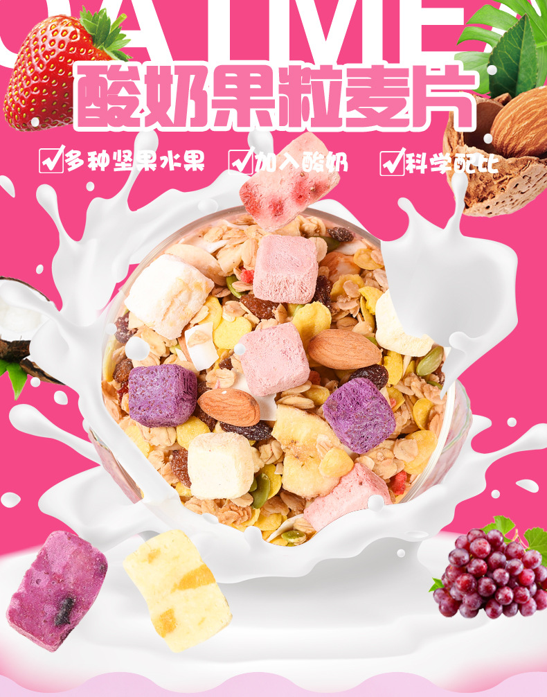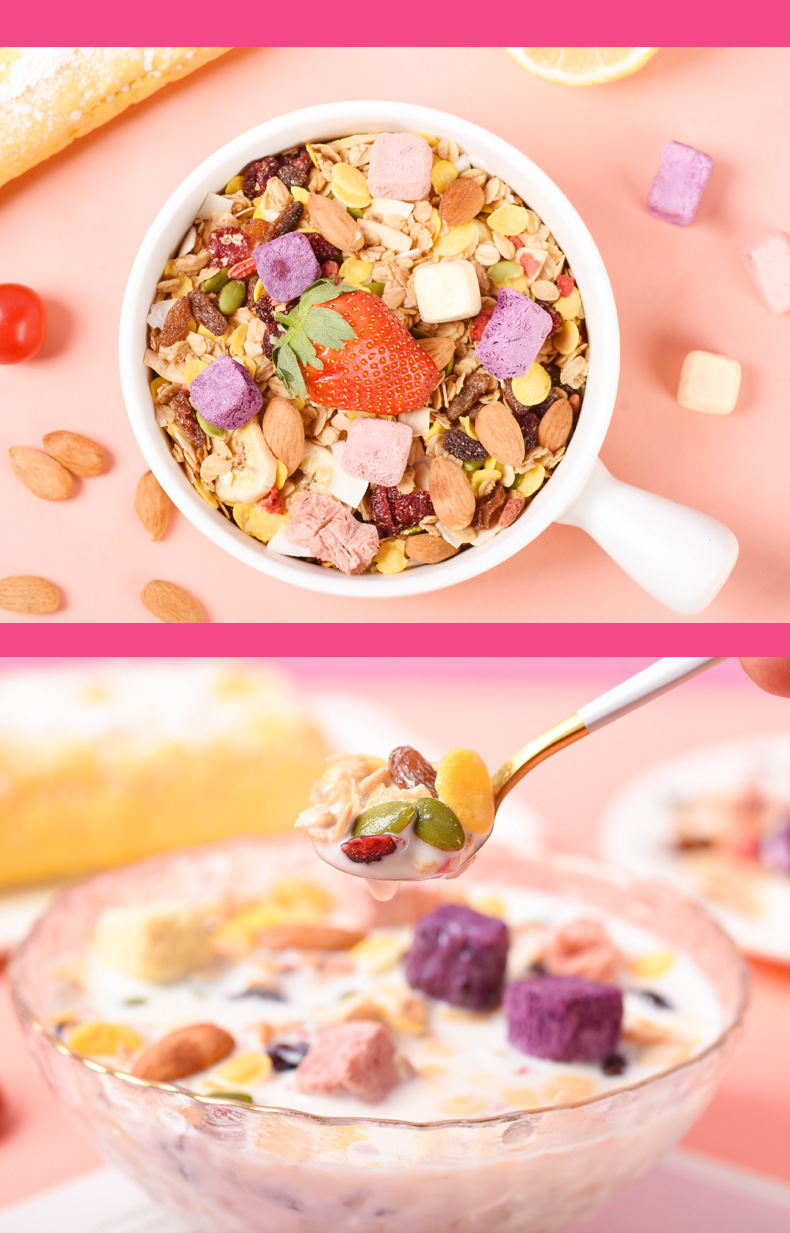 | Raw materials and ingredients | Baked cereal corn chips banana chips dried grape seeds almond pumpkin seeds cranberry yogurt block coconut chips freeze-dried strawberry diced |