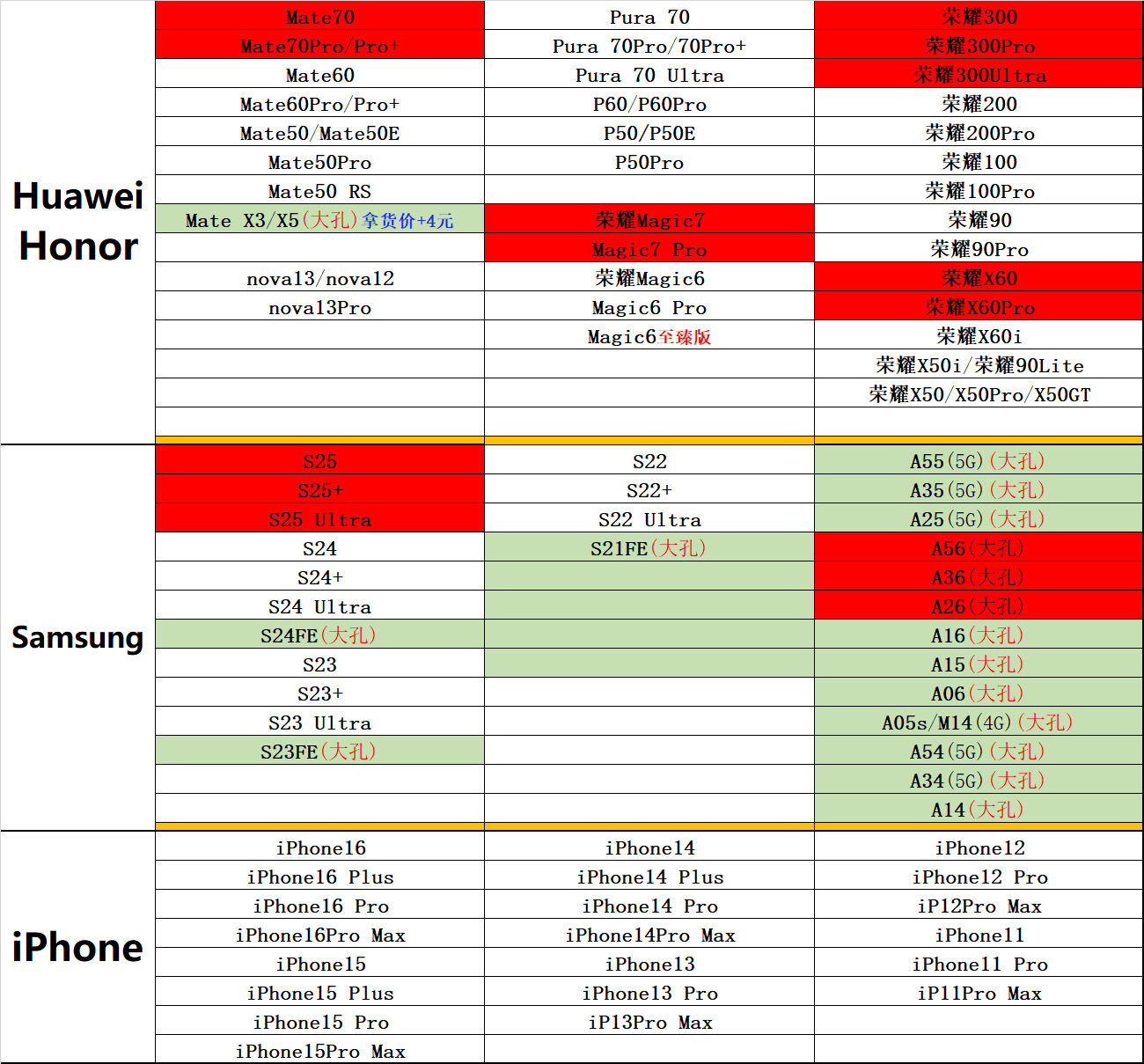 | Applicable models | Samsung s25,Samsung s25 plus,Samsung s25 ultra,Samsung s24,Samsung s24 plus,Samsung s24 ultra,Samsung s23,Samsung s23 plus,Samsung s23 ultra,Samsung s23fe,Samsung s22,Samsung s22 plus,Samsung s22 ultra,Samsung s21fe,Samsung a55 (5g),Samsung a35 (5g),Samsung a25 (5g),Samsung a15,Samsung a05s/m14 (4g),Samsung a54 (5g),Samsung a34 (5g),Samsung a14,Samsung a56,Samsung a36,Samsung a26,Samsung a16,For other models, please note when placing an order |