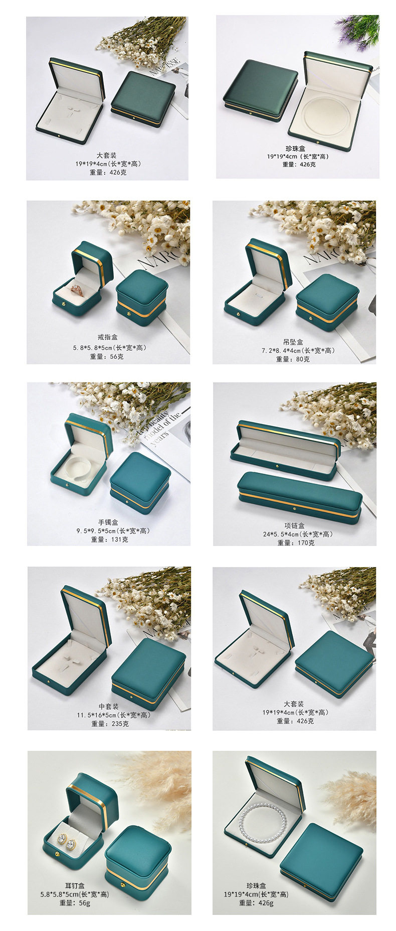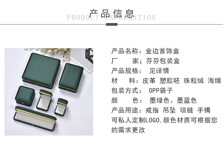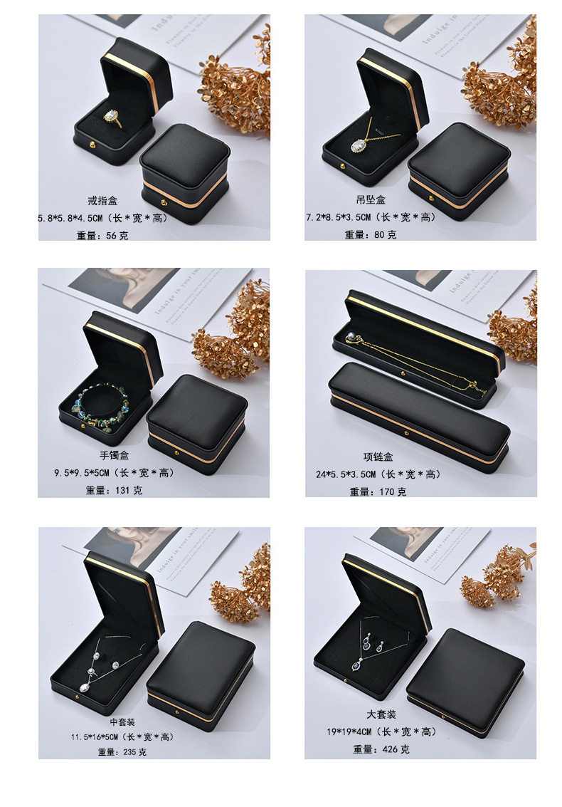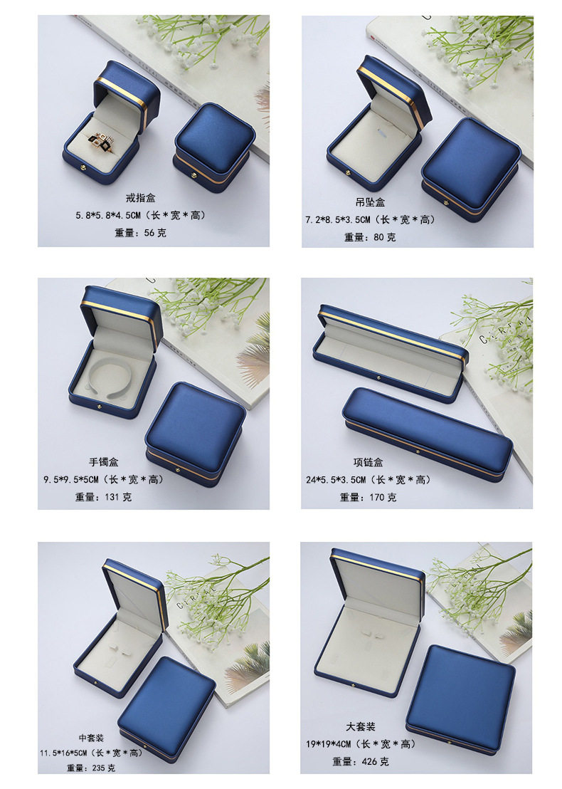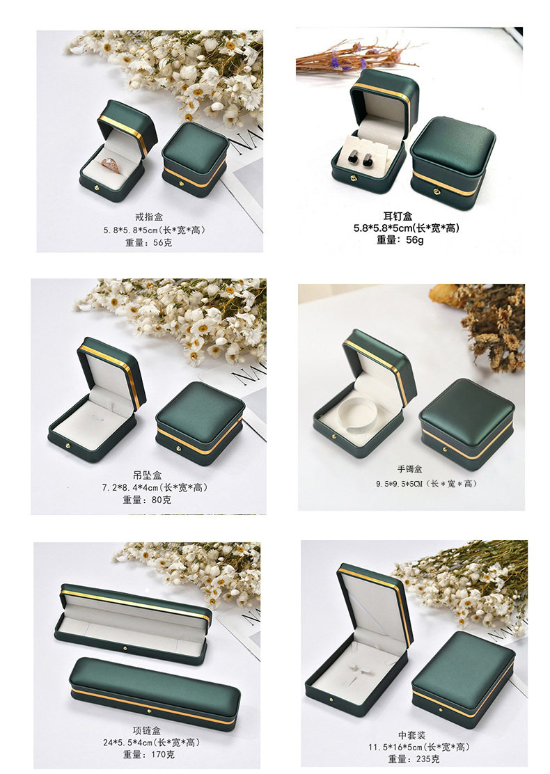 | Specifications and models | Dark green gold edge; ring box 5.8*5.8*4.5cm,Dark green gold edge; earring box 5.8*5.8*4.5cm,Dark green gold edge; pendant box 7.2*8.5*3.5cm,Dark green gold edge; bracelet box 9.5*9.5*5cm,Dark green gold edge; necklace box 24*5.5*3.5cm,Dark green gold edge; medium set 11.5*16*5cm,Dark green gold edge; large set 19*19*4cm,Dark green gold edge; round center pearl box 19*19*4cm,Blue-green gold edge; ring box 5.8*5.8*4.5cm,Blue green gold edge; earring box 5.8*5.8*4.5cm,Blue-green gold edge; pendant box 7.2*8.5*3.5cm,Blue-green gold edge; bracelet box 9.5*9.5*5cm,Blue-green gold edge; necklace box 24*5.5*3.5cm,Blue green gold edge; medium set 11.5*16*5cm,Blue green gold edge; large set 19*19*4cm,Blue-green gold edge; round center pearl box 19*19*4cm,Burgundy gold edge; ring box 5.8*5.8*4.5cm,Burgundy gold rim; earring box 5.8*5.8*4.5cm,Burgundy gold edge; pendant box 7.2*8.5*3.5cm,Burgundy gold edge; bracelet box 9.5*9.5*5cm,Burgundy gold edge; necklace box 24*5.5*3.5cm,Burgundy gold edge; medium set 11.5*16*5cm,Burgundy gold edge; large set 19*19*4cm,Burgundy gold edge; round center pearl box 19*19*4cm,Royal blue gold edge; ring box 5.8*5.8*4.5cm,Royal blue gold edge; earring box 5.8*5.8*4.5cm,Royal blue gold edge; pendant box 7.2*8.5*3.5cm,Royal blue gold edge; bracelet box 9.5*9.5*5cm,Royal blue gold edge; necklace box 24*5.5*3.5cm,Royal blue gold edge; medium set 11.5*16*5cm,Royal blue gold edge; large set 19*19*4cm,Royal blue gold edge; round center pearl box 19*19*4cm,White gold edge; ring box 5.8*5.8*4.5cm,White gold edge; earring box 5.8*5.8*4.5cm,White gold edge; pendant box 7.2*8.5*3.5cm,White gold edge; bracelet box 9.5*9.5*5cm,White gold edge; necklace box 24*5.5*3.5cm,White gold edge; medium set 11.5*16*5cm,White gold edge; large set 19*19*4cm,White gold edge; round center pearl box 19*19*4cm,Black gold edge; ring box 5.8*5.8*4.5cm,Black gold edge; earring box 5.8*5.8*4.5cm,Black gold edge; pendant box 7.2*8.5*3.5cm,Black gold edge; bracelet box 9.5*9.5*5cm,Black gold edge; necklace box 24*5.5*3.5cm,Black gold edge; medium set 11.5*16*5cm,Black gold edge; large set 19*19*4cm,Black gold edge; round center pearl box 19*19*4cm |