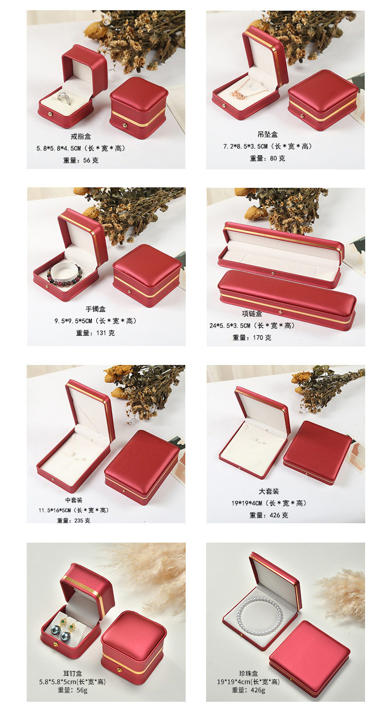 | Specifications | Bracelet box 9.5*9.5*5cm,Large set 19*19*4cm,Necklace box 24*5.5*3.5cm,Ring box 5.8*5.8*4.5cm,Medium set 11.5*16*5cm,Round center pearl box 19*19*4cm,Earring box 5.8*5.8*4.5cm,Pendant box 7.2*8.5*3.5cm |
