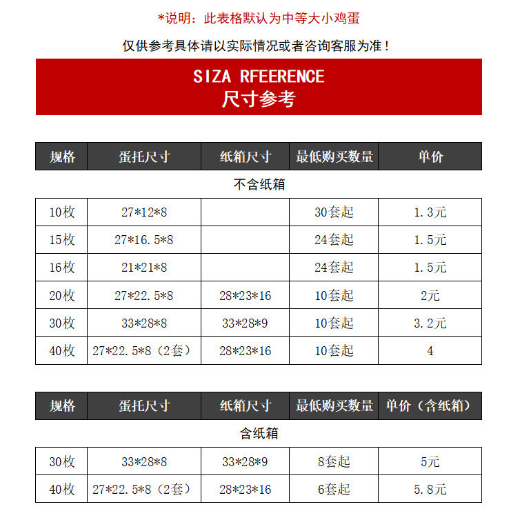| Specification model | 10 egg trays [free shipping for 30 sets]; customized; 0.5,15 egg trays [free shipping for 24 sets]; customized; 0.5,20 egg trays [free shipping for 16 sets]; customized; 0.5,30 egg trays [free shipping for 10 sets]; customized; 0.5,Special shot of egg tray samples [limited to 1 piece]; customized; 0.5,6 egg trays [free shipping for 20 sets]; customized; 0.5,Special shooting for sample customization; personalized; 0.5,25 egg trays [free shipping for 10 sets]; customized; 0.5 |