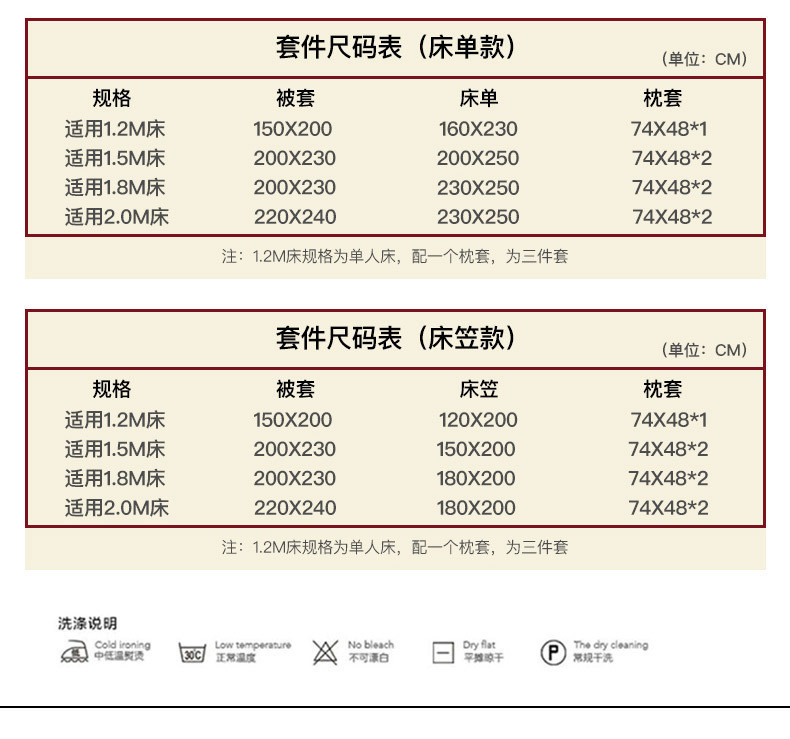| Dimensions | 1.2m bed sheet [quilt cover 150*200/sheet 160*230] three-piece set,1.5m bed sheet model [quilt cover 200*230/sheet 200*250] four-piece set,1.8m bed sheet model [quilt cover 200*230/sheet 230*250],2.0m bed sheet [quilt cover 220*240/sheet 230*250],1.2m fitted sheet [quilt cover 150*200/fitted sheet 120*200] three-piece set,1.5m fitted sheet [quilt cover 200*230/fitted sheet 150*200] four-piece set,1.8m fitted sheet [quilt cover 200*230/fitted sheet 180*200] four-piece set,1.8m fitted sheet [quilt cover 220*240/fitted sheet 180*200] four-piece set |